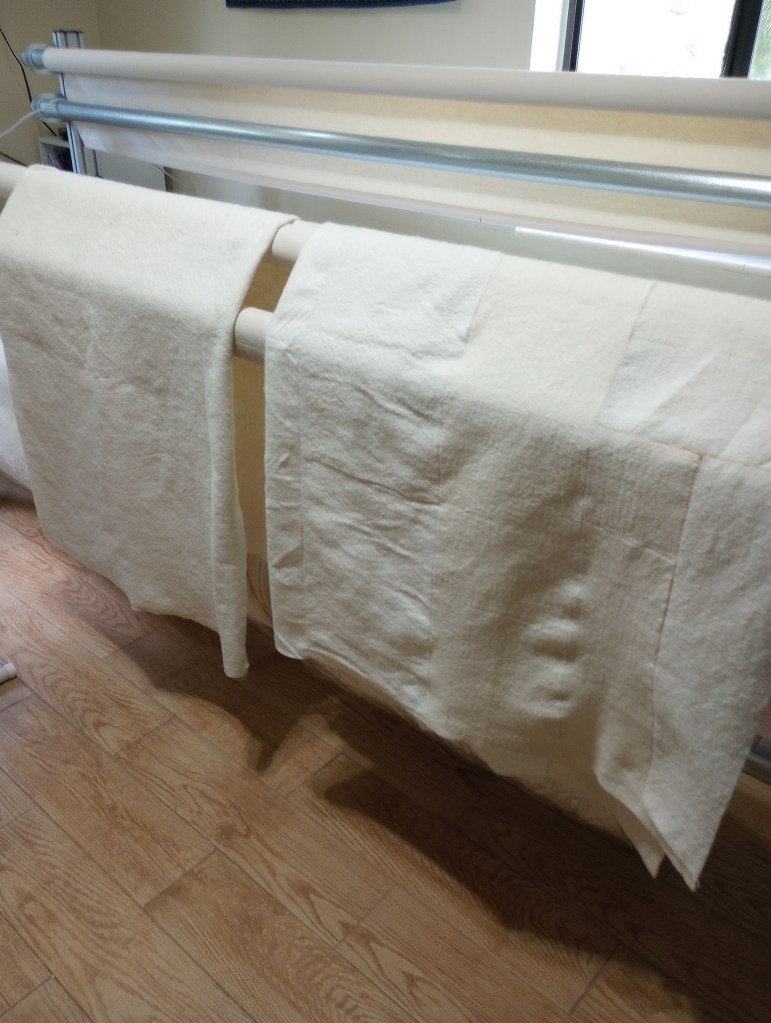 Rocky (our cat) has his own little piece of batting to lie on and nap, watch me, or look out the window. I know people have cat allergies so I’m careful to keep the rest of my batting covered.
