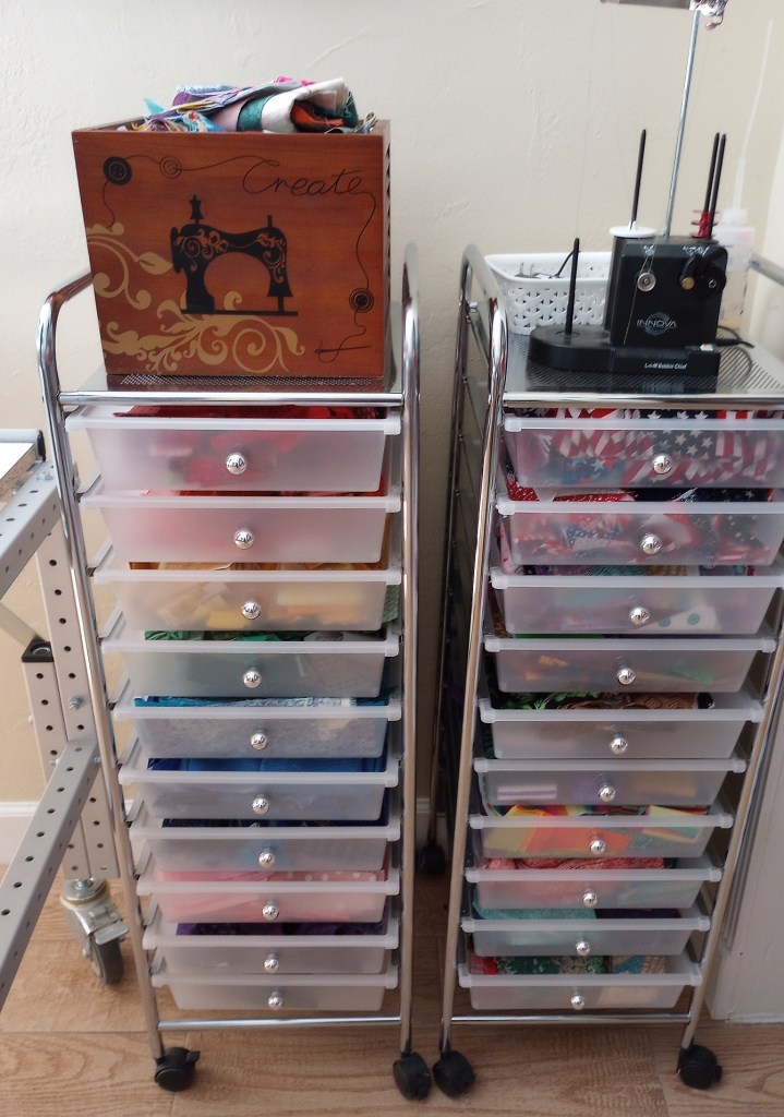 As you can see, I have an overflow of fabric for both string and scrap quilts, not to mention the two drawers of fat quarters. I have ideas for all these fabrics! I don’t want to just store them; I want to get a better habit established to use them regularly.