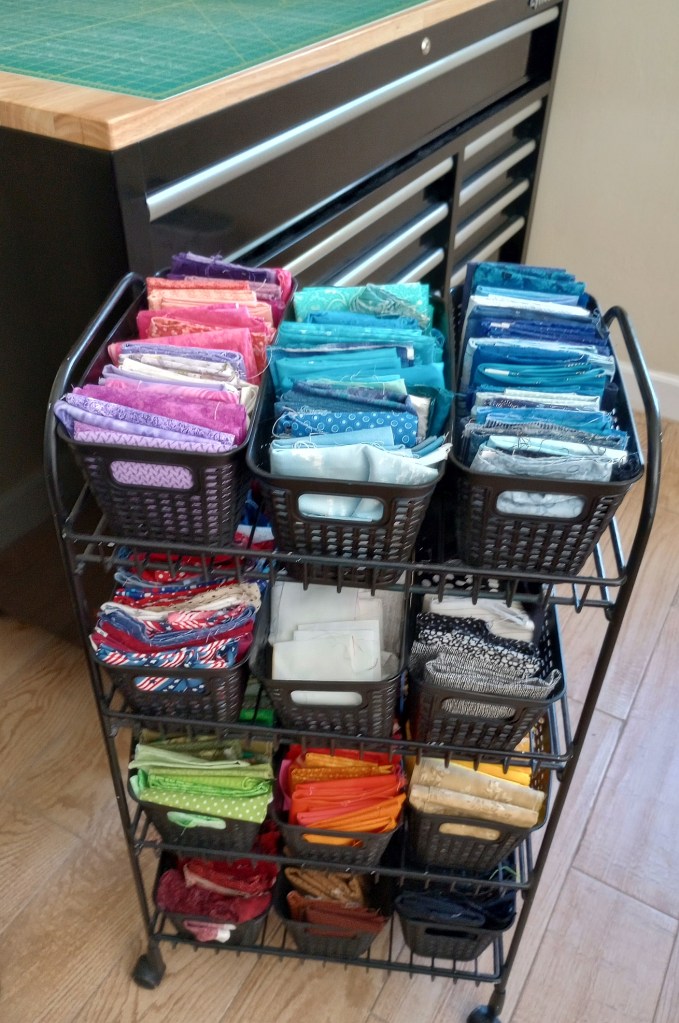 Saturday – Reset my sewing room including piecing frankenbatts, trimming scraps, make sure all fabric is noted with the yardage and put away. If there’s extra time, prep for the next project.