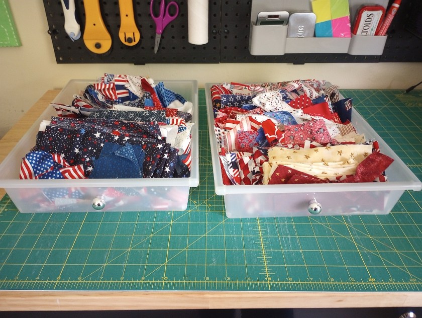 I decided patriotic fabrics would be my first target. In this post on August 18th, I wondered how many string blocks I could create from two small drawers. I decided to clear out a bin of patriotic scraps in my cart at the same time as that was also pretty full.