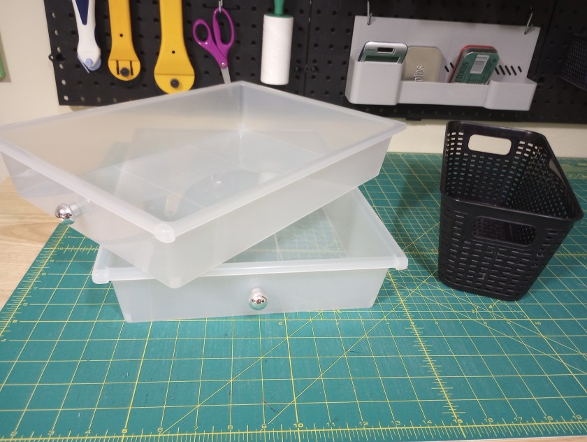 A switch on my long arm broke, so I’ve been organizing while waiting for the part. The room doesn’t really need it, but we expect our hurricane windows to be installed in 4 to 6 weeks. When we get the notice from the installer, I’ll have to quickly move everything to one corner. I’m using these couple of days to consolidate as much as I can. All the furniture is on casters, including the long arm frame, so moving things shouldn’t be too difficult.