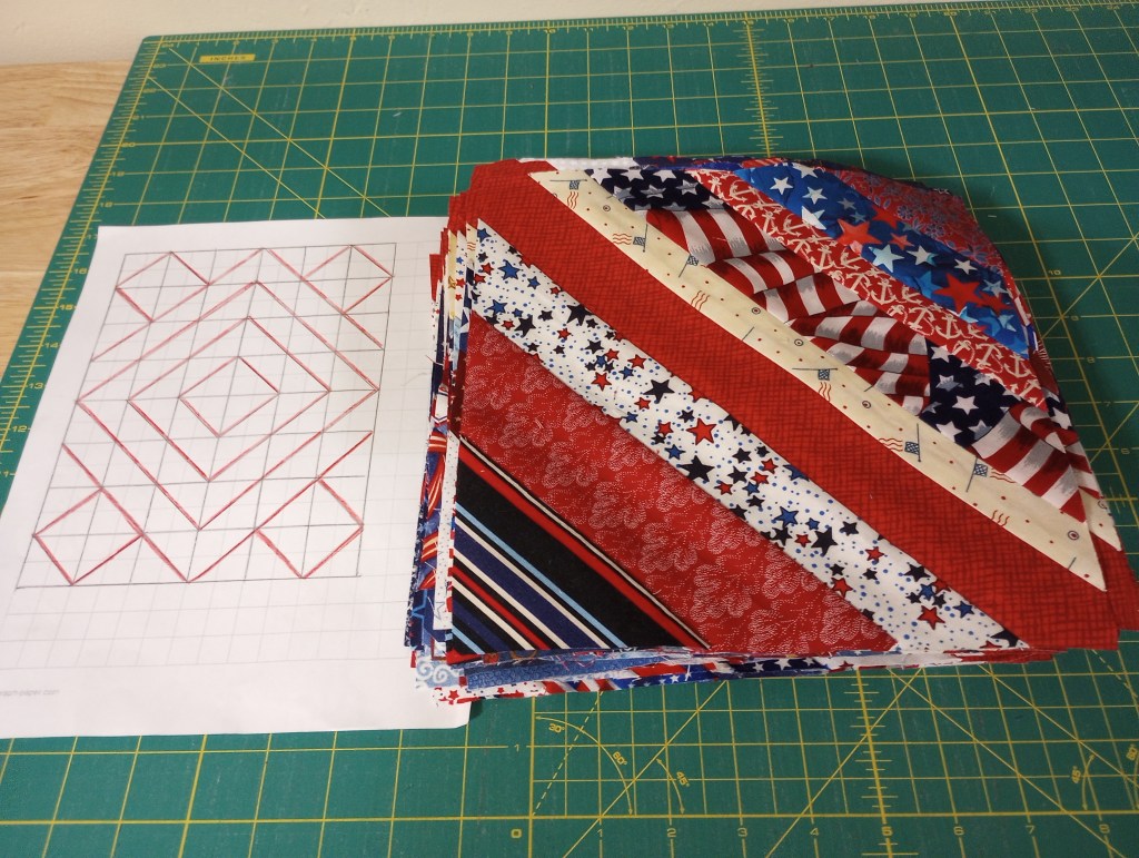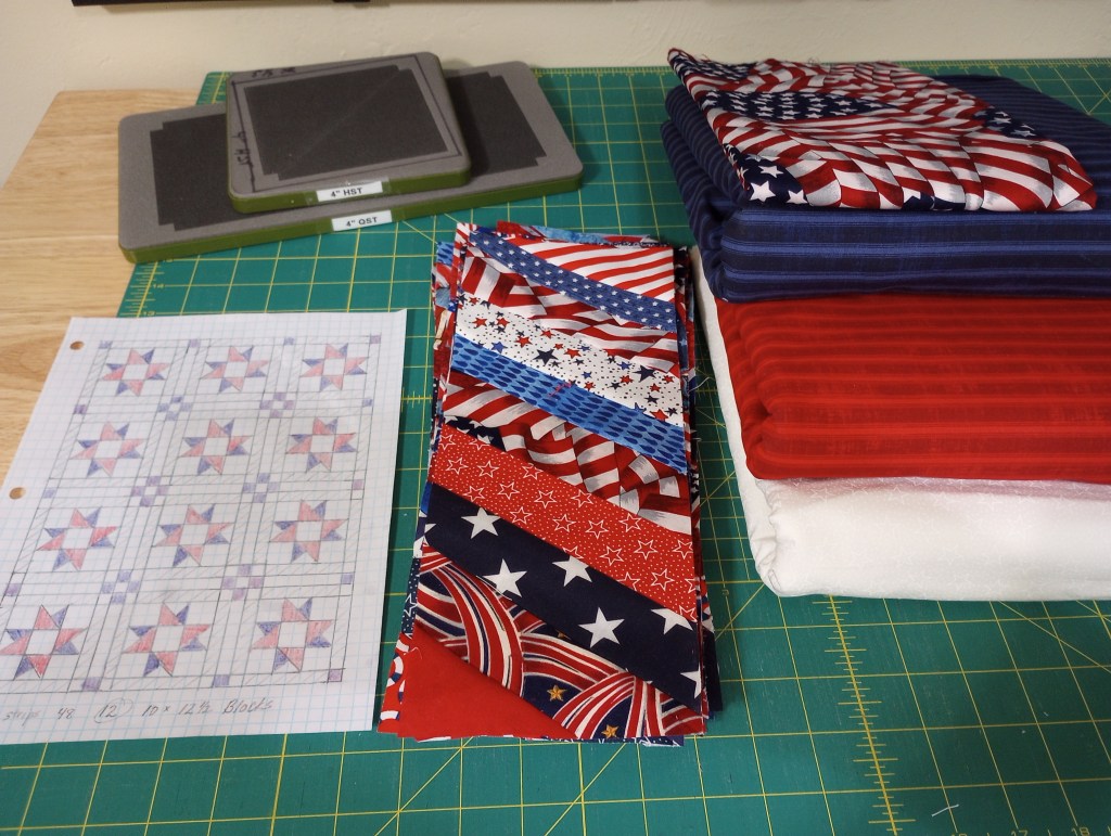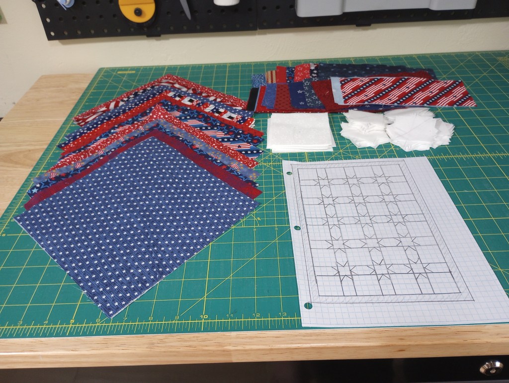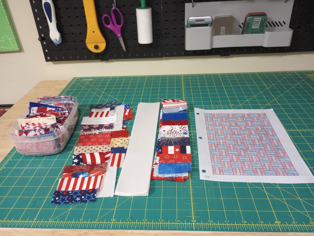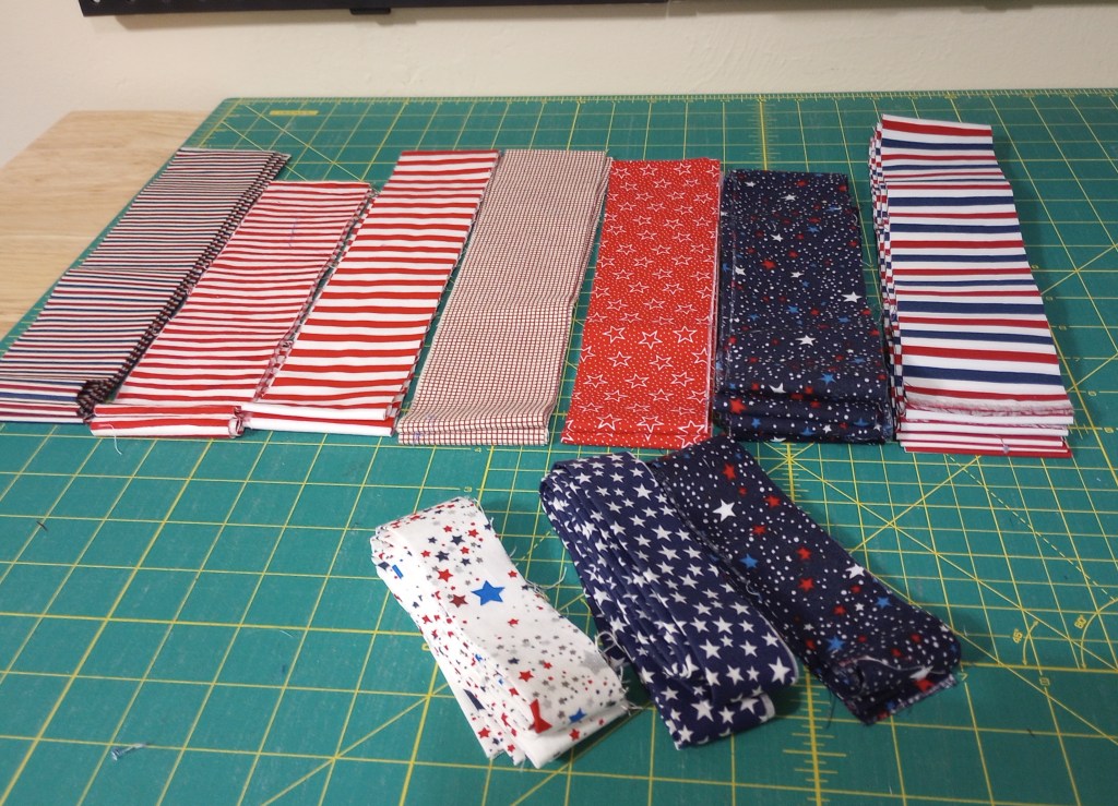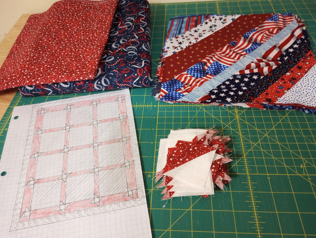 This project will need a border to reach my preferred size, and I have several pieces of American flag fabric leftover from backing cutoffs to use.