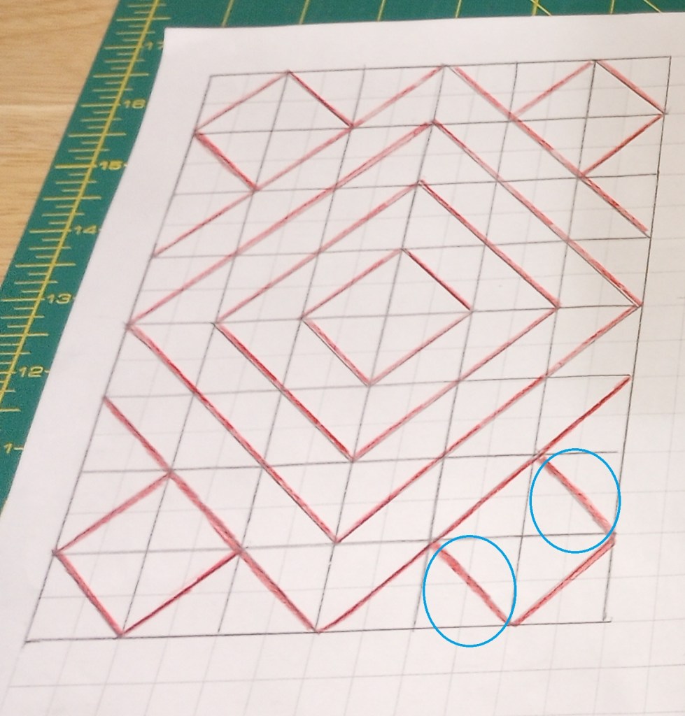 Instead, I stayed up late and graphed a block that would use 1 1/2″ wide pieces. The block is an usual one, but looking at where the sashing and cornerstones are located helped to define it.