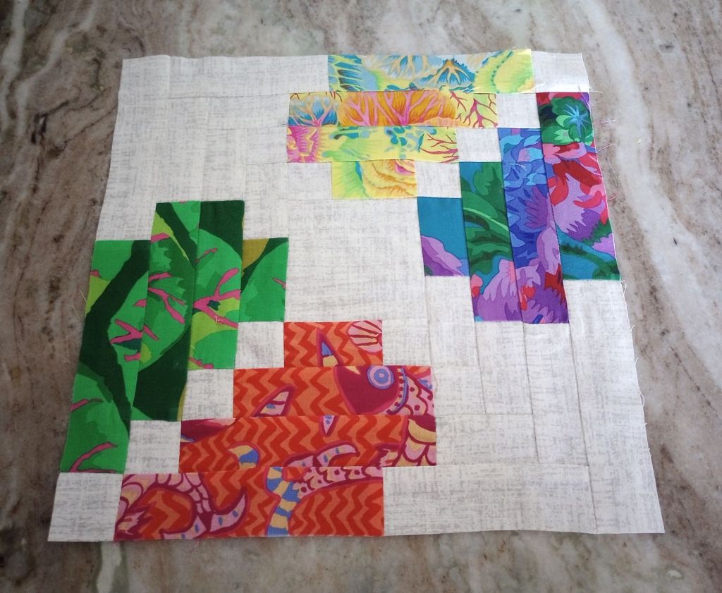 I also made a sample block with the Kaffe fabric scraps. I’m glad I did because I quickly realized I’m not going to be able to make one block a day like I’d planned.