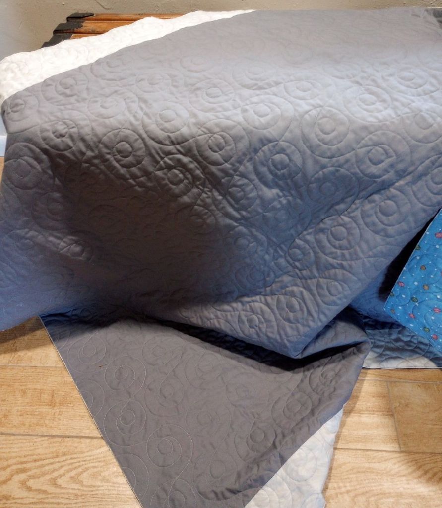 Other than that quilt at the beginning of the week, I didn’t get anything else quilted. My long arm is out of commission for a few days. It’s only a year old so I don’t think it’s a mechanical problem, but it won’t pick up the bobbin thread. My husband tried to fix the clasp on top of the case, but it broke. I dropped the case a few days ago, and now the thread isn’t coming out through the hole on top; it’s sliding off to the side instead.
