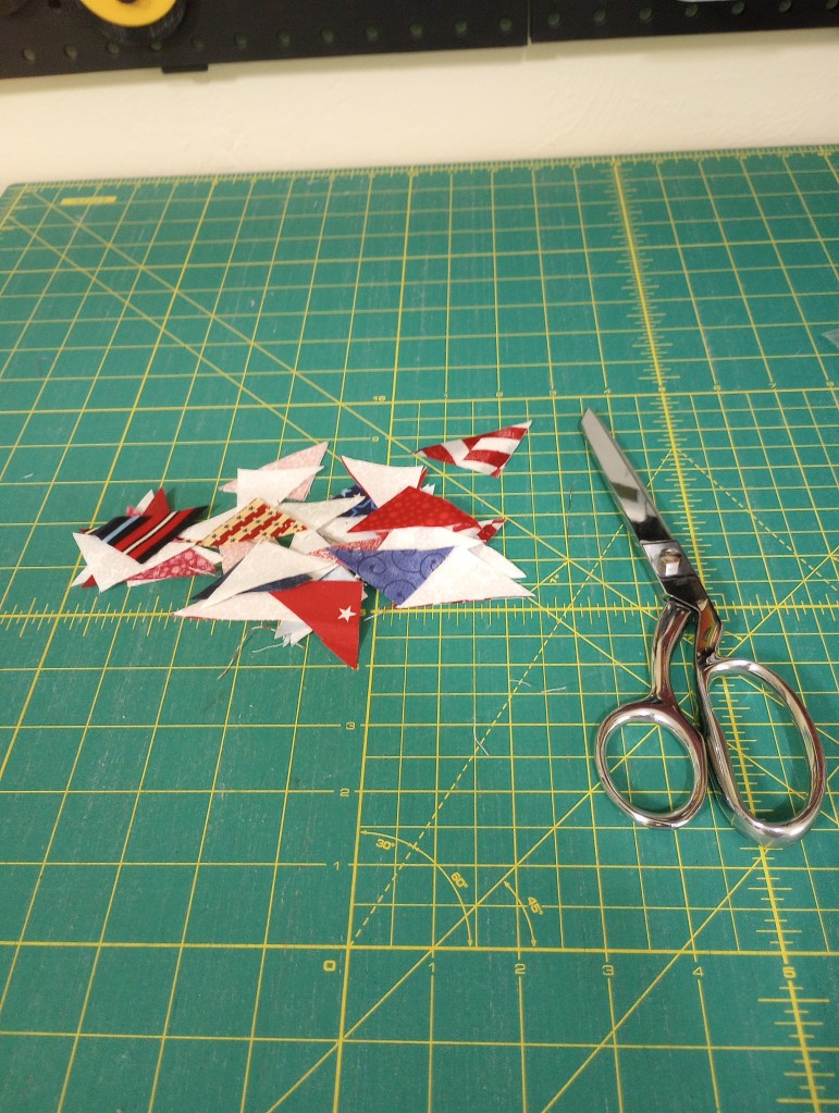 The string blocks for this layout are 12.5″. In the scrap bin were the 32 waste triangles leftover from the patriotic round robin I finished last month.I decided to set the blocks with a friendship star type sashing to use them. Most will end up in the outside border. I’ll need a few more than what I have but, I’ll use the sew & flip corners on the sashing pieces to make them rather than making separate HSTs.