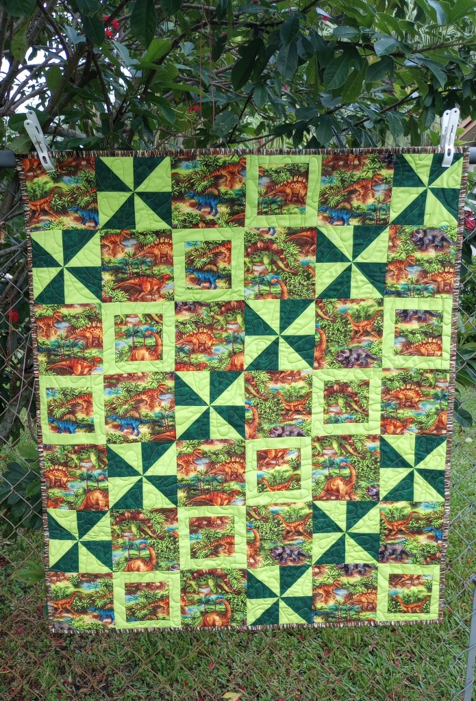I was a little tired of the dinosaurs after finishing the quilt below in July and was ready for a break. Focusing on a new project made sewing a pair of fabric together at a time for this one a lot easier and it was finished in no time.