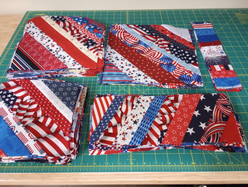 Instead of using sashing with string blocks, I used string sashing with pieced blocks. I began with a dozen 10″ x 12.5″ string rectangles (the blocks in the lower left corner of the photo below).