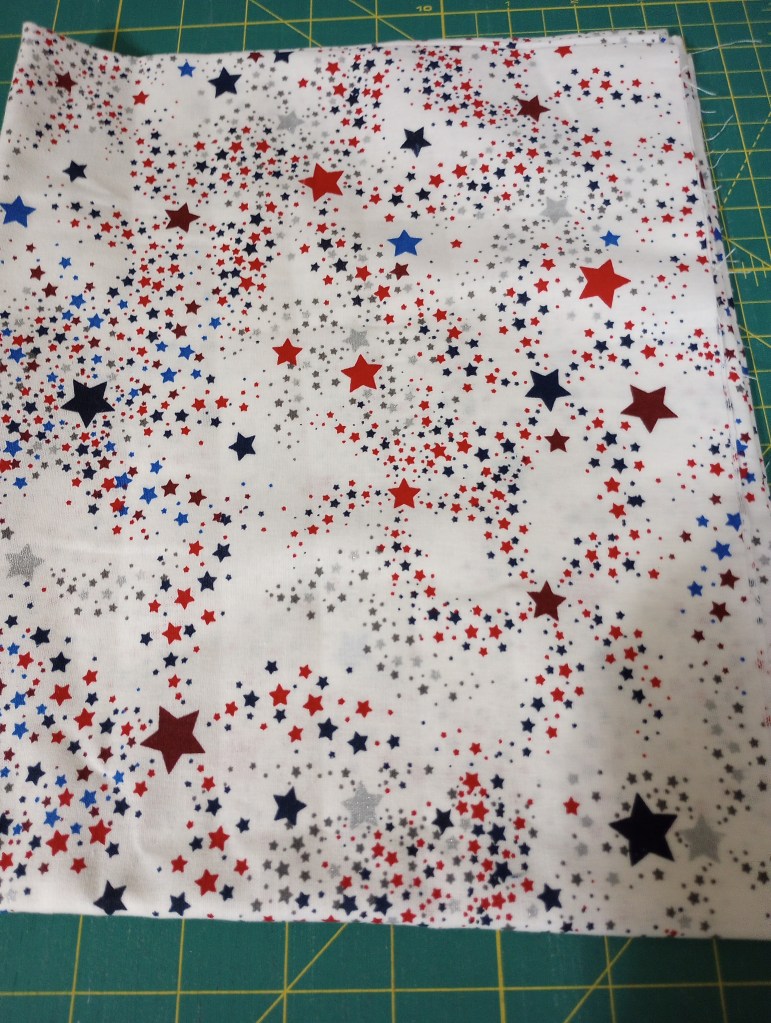I chose not to use the blue and red stripe fabrics I originally considered because I just didn’t want to deal with trying to keep the stripe pieces all positioned in the correct direction. 😉 I also substituted the flag print for the center of the star after making the first block. I realized it was too busy and decided to use this star print on white instead.