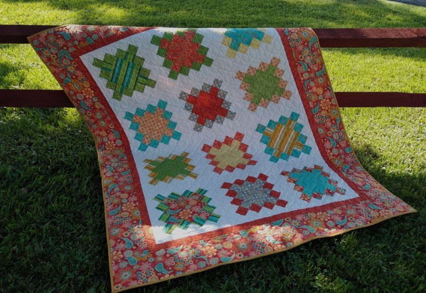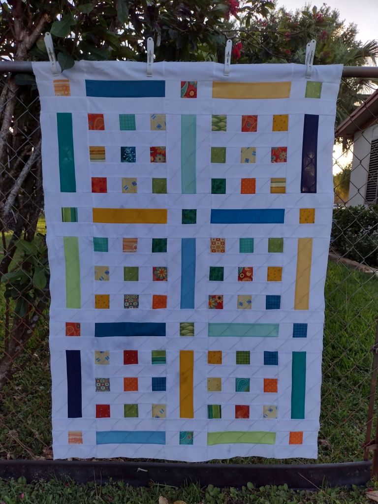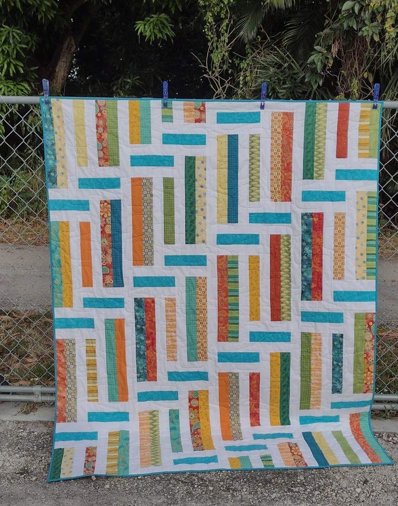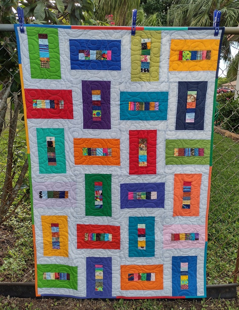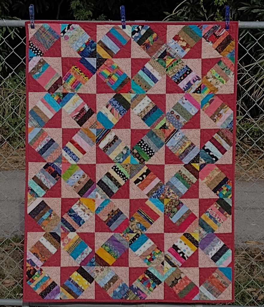 A few partial solid strips left after making the blocks were used for the scrappy binding.