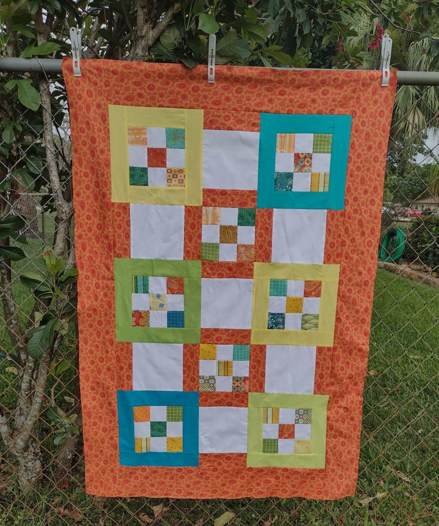 I had the perfect orange from that big JoAnn’s liquidation purchase I made a few months ago. I like it so well that I’ll use it for both the backing and the binding.