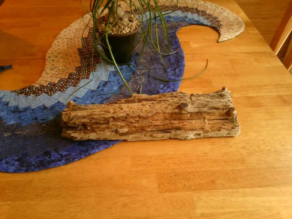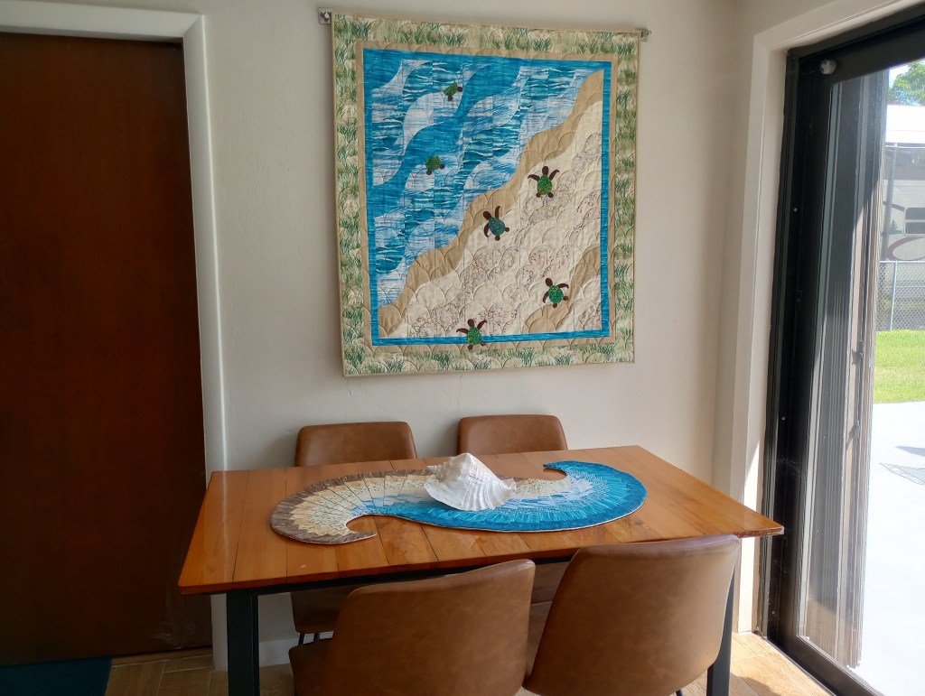 Do you notice the sailboat on the shelf in the photo above with the photo next to it of a piece of driftwood ? We found that driftwood several years ago on a vacation in Ormond Beach. The same vacation that I came home and made the “Frame of Mind” quilt in my guest room above.