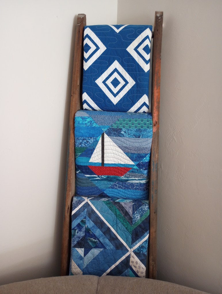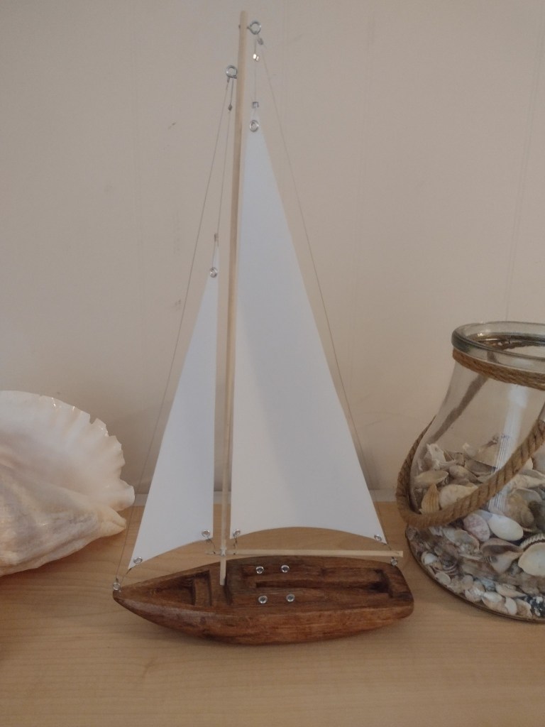 We had rented a little bungalow just steps from the ocean. I thought I’d DIY the driftwood into a sailboat but never did so it sat in a closet. One day an acquaintance (who came down to Florida every year for the winter) told me how her son in Maine used to carve them but had since retired. I begged her to ask him to do just one more. She really wanted to get a top quilted quickly and so I took a chance and bartered the quilting for driftwood carving. I don’t like quilting for other people unless it’s a donation quilt (too much stress) but I really, really wanted the carved sailboat. He said he’d do one more since it was his mother who’d asked. I was really surprised when he mailed it back to me and I saw that he’d even rigged the sails. It was way beyond my wildest expectation and I absolutely love it!