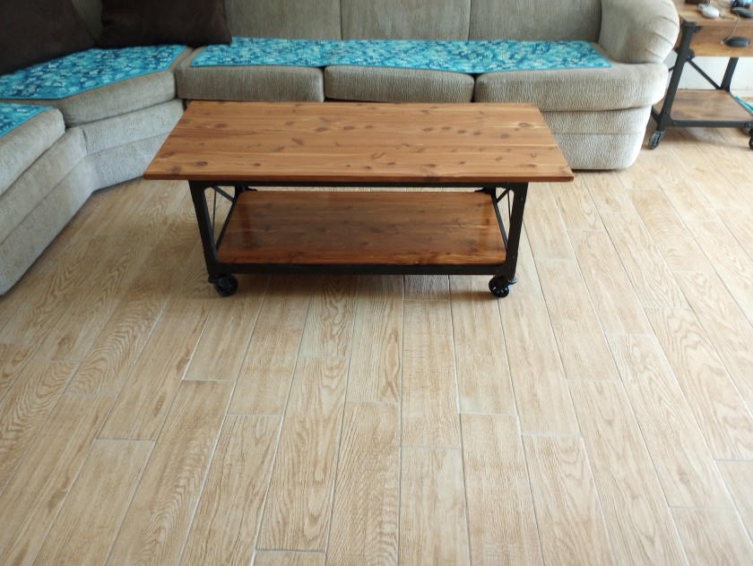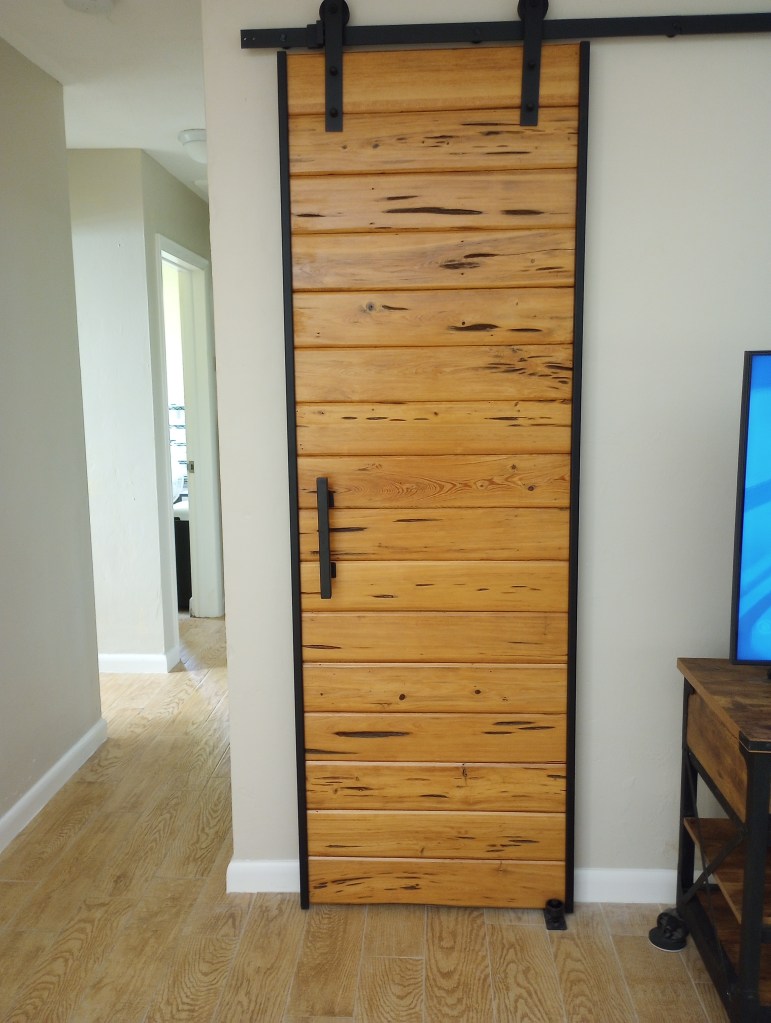My husband made the barn door out of reclaimed pecky cypress and the coffee table from a cedar chest he found that was being tossed out because it was damaged.