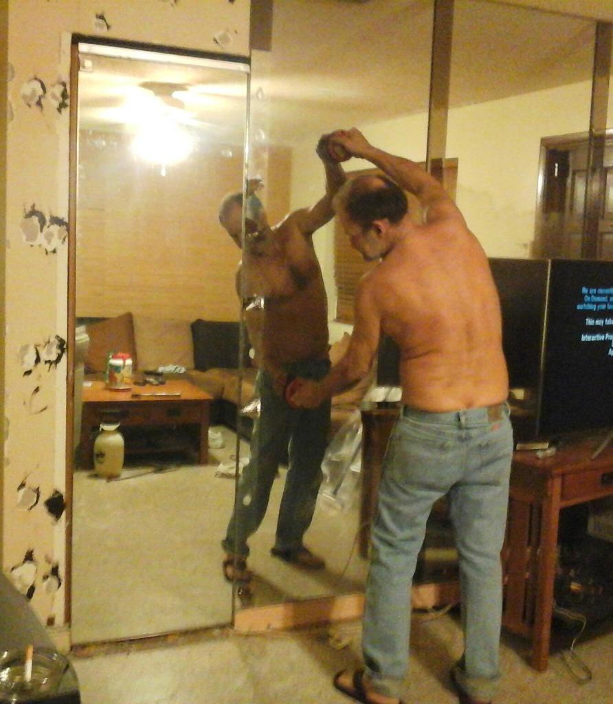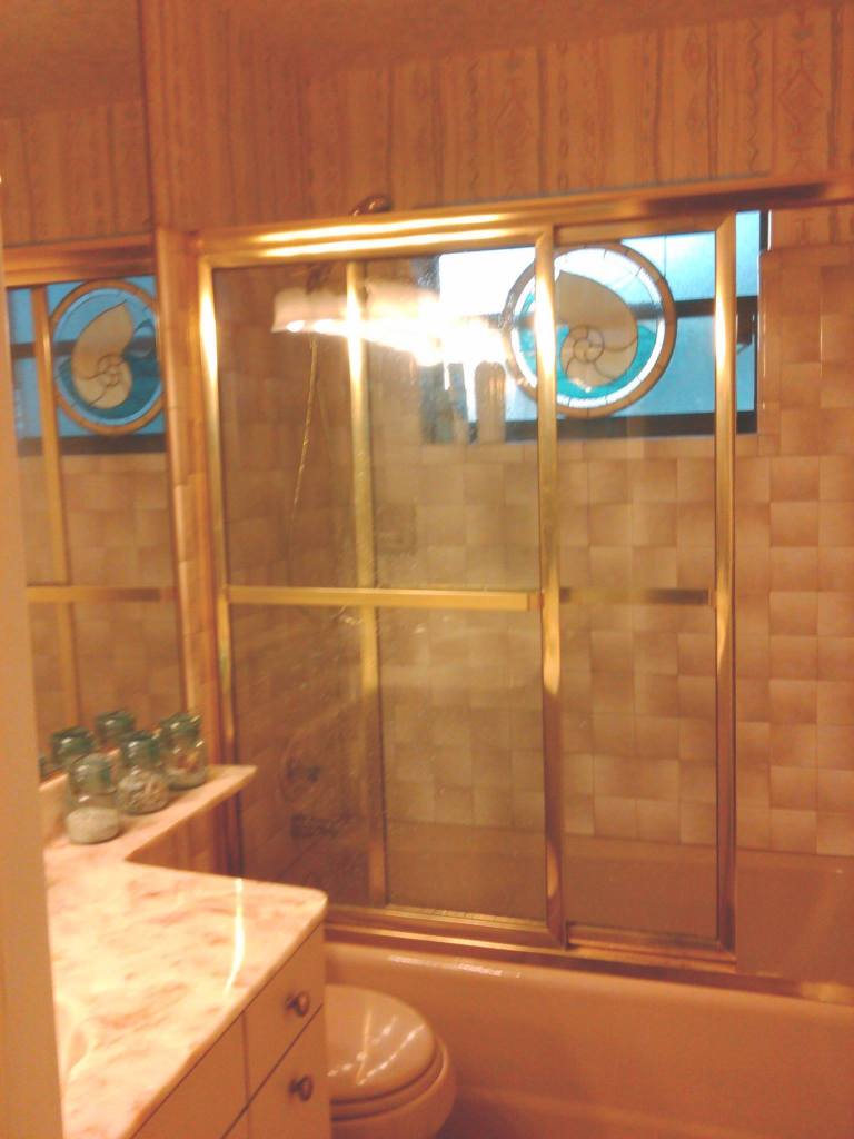 Here are some before photos. The mirrored wall and door were the first thing to go over a dozen years ago. Reclaimed wood doors were out of our price range so it had just a plain wood door for a long, long time. Several years later, the bathroom got an update and then the kitchen. 🙂