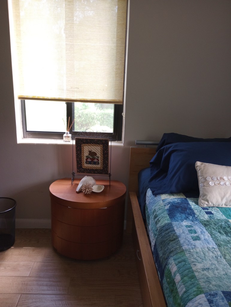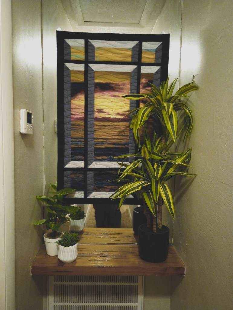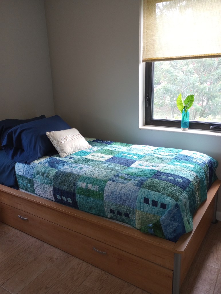 I made the quilt on the bed after a vacation in Ormond Beach. I call it “frame of mind”. I remember when I put it on that bed… it didn’t really “match” the rest of the house but I immediately noticed how much I liked the feel of a cool watery colors. (My stepson found the trundle bed frame that’s in this room and asked if we wanted it. I’m not sure where he got it but, knowing like father – like son, I imagine it was on the side of the road. It was perfect for the space. I couldn’t have found a better one had I gone shopping for it and, I never would have considered looking for one with a trundle bed drawer for quilt storage!