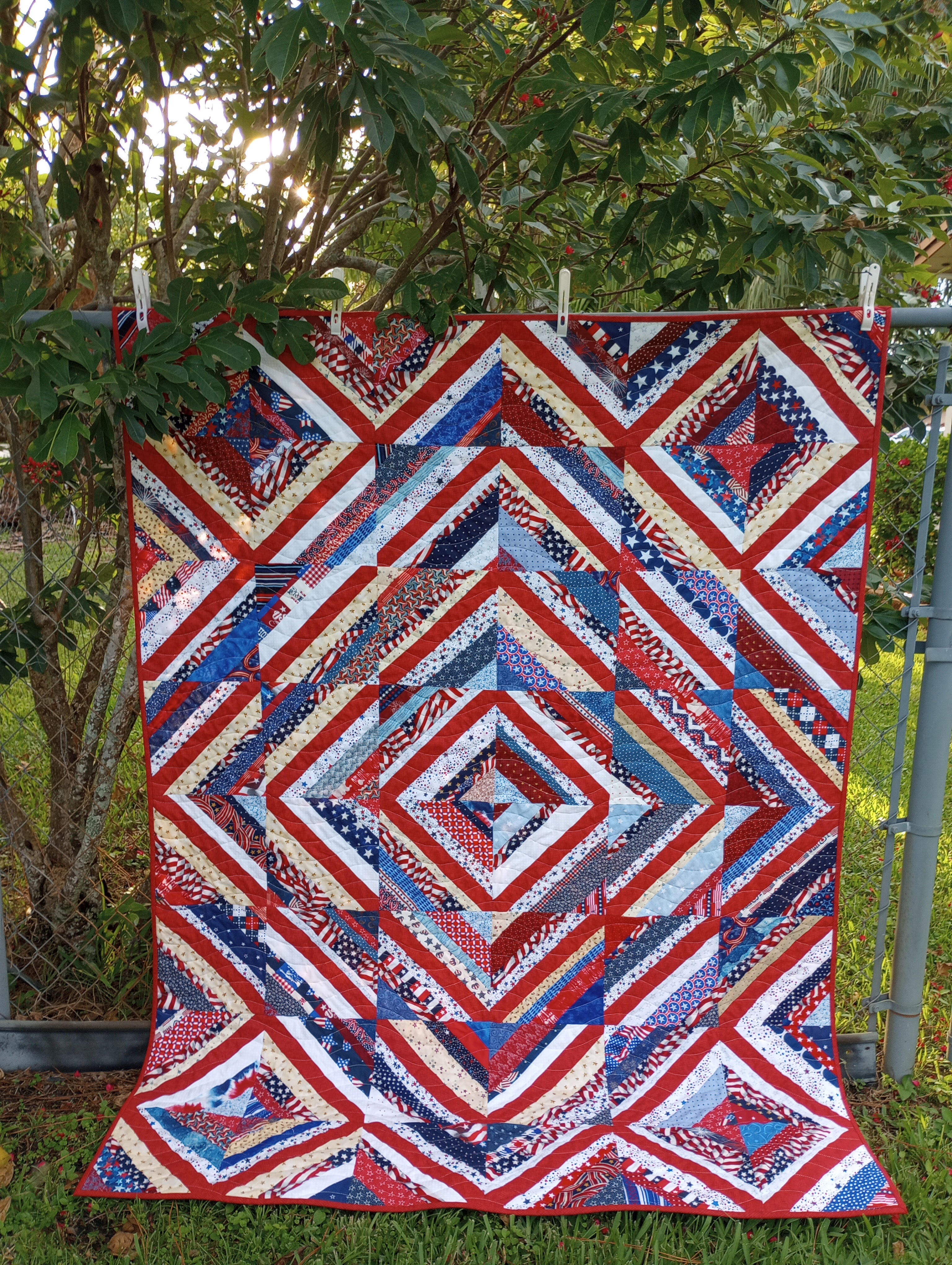 I finished one of my patriotic string quilts in the last two weeks also. I’m happy with what I did get finished but, not so much with all the things I’ve started and put aside. Oops! As soon as I finish assembling the fair quilt I’ll get busy with all the WIPS (works in progress) so I can enjoy making a few things for Christmas. It’ll be here before we know it!