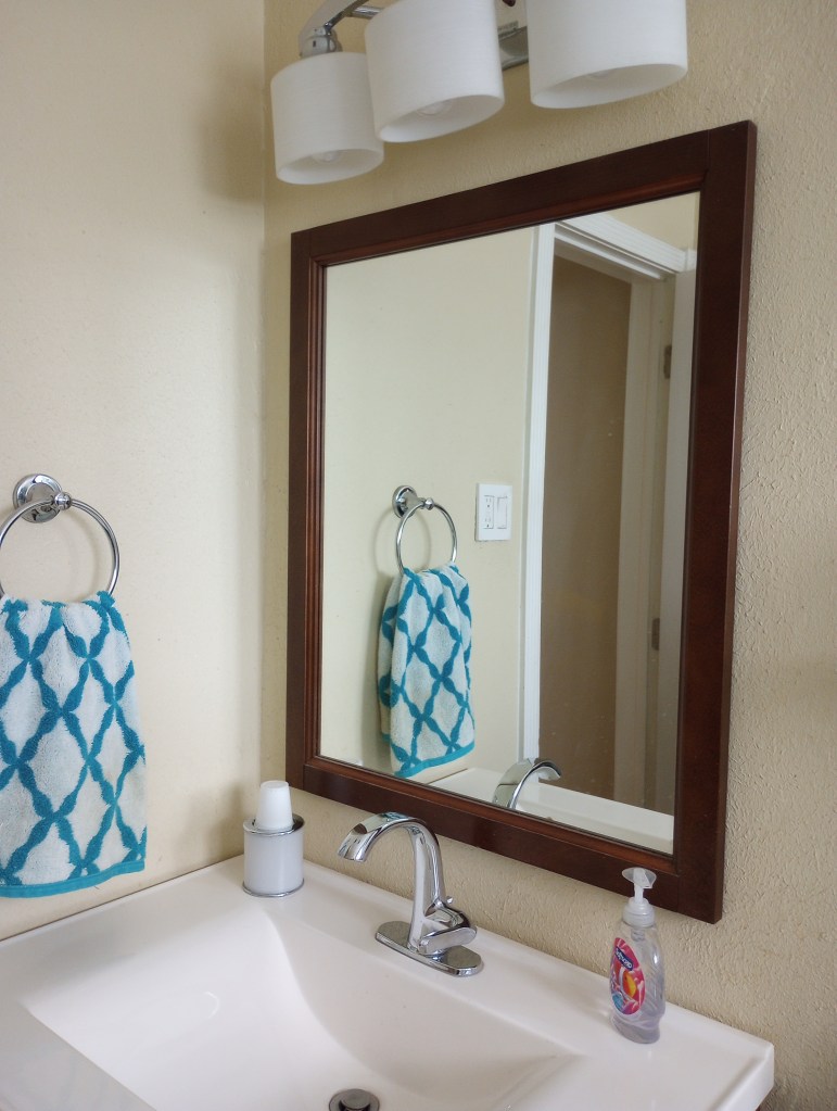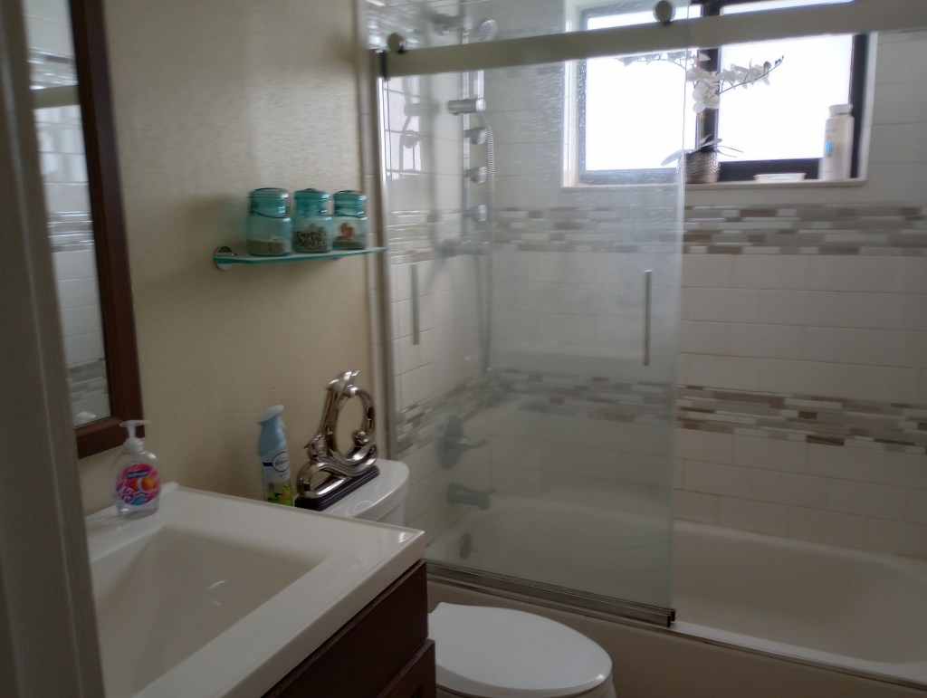 Nothing special about this bathroom except it was the first room my husband decided we needed to remodel, that is after taking down a mirrored wall and grass cloth wallpaper off the two living room walls. That’s probably been a decade ago. Last year for Christmas I asked for the little shelf to hold my blue canning jars of shells. I know, it was a strange gift request but, he listened, ordered it, then put it up for me without me ever having to mention it again. We only have one bathroom but, that also means only one to clean! 🙂