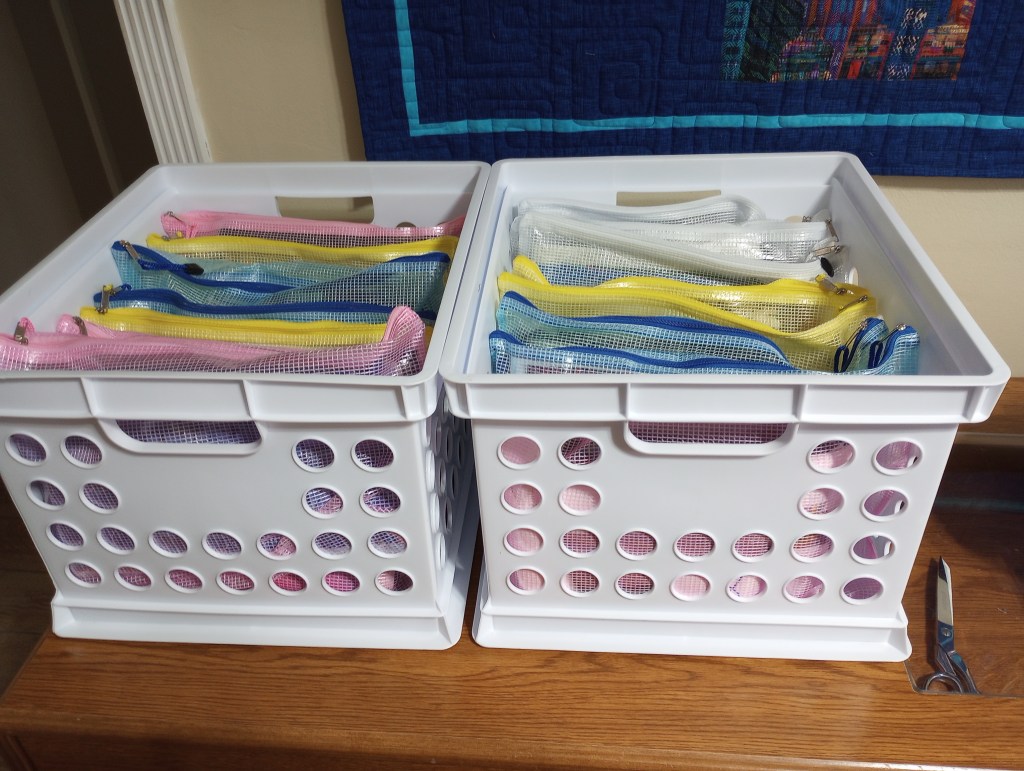 I really like these plastic mesh zipper project bags from Amazon. Temu has less expensive ones but I didn’t want to order more than I needed (trying to be more intentional about not acquiring more things I’ll have to store). I liked getting them the next day too so I could put everything away and move on to something else.