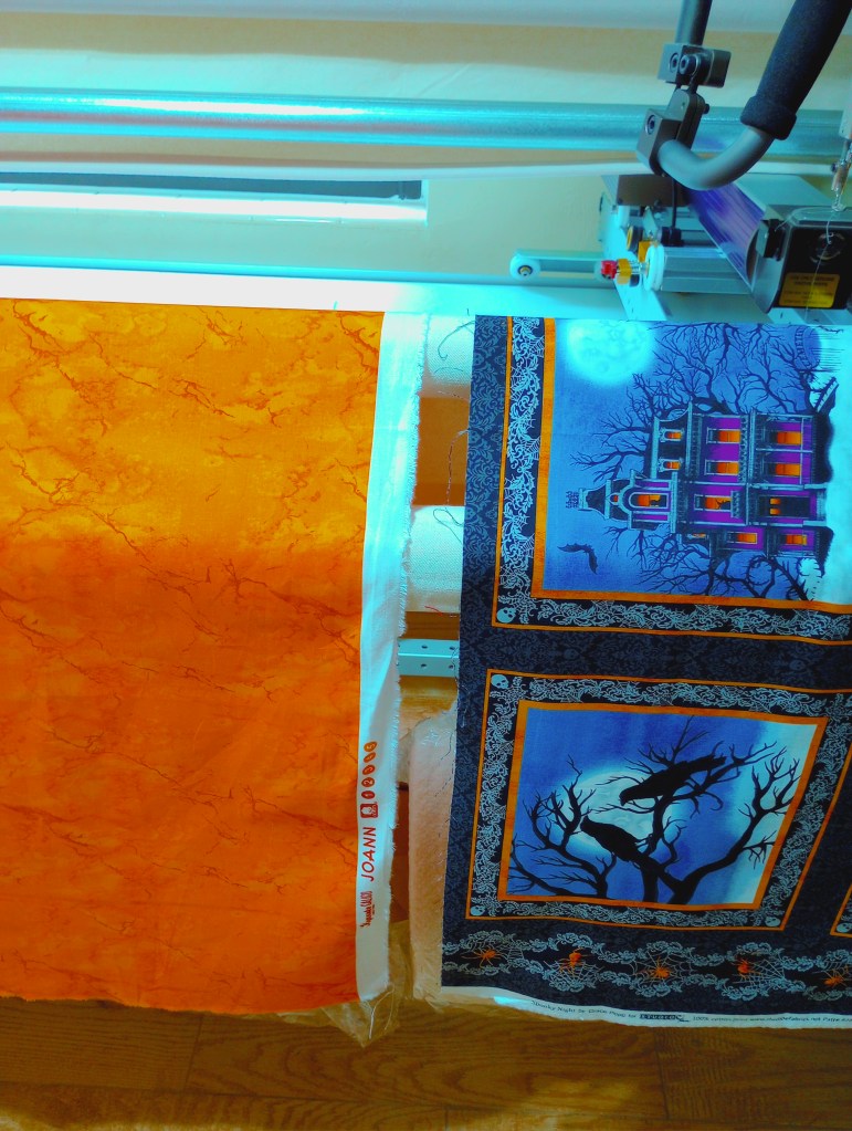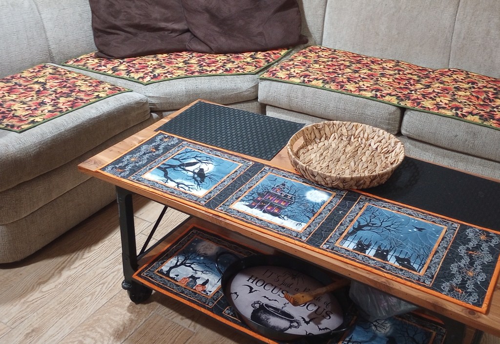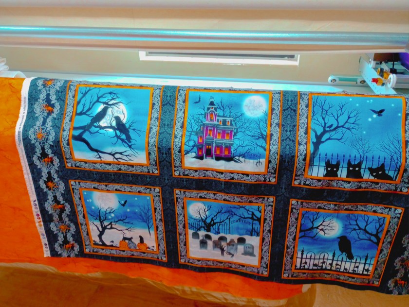 THIS is the “something else”. I came across this six block panel and remembered buying it when the local quilt shop had a sale on all their panels around this time last year. Time got away from me and I never got to making something with it. I don’t want or need another Halloween quilt so I plan to quilt it as it is, cut it in half, then bind each of the two pieces to make two table runners. One for the top of my coffee table and one for the shelf under it.