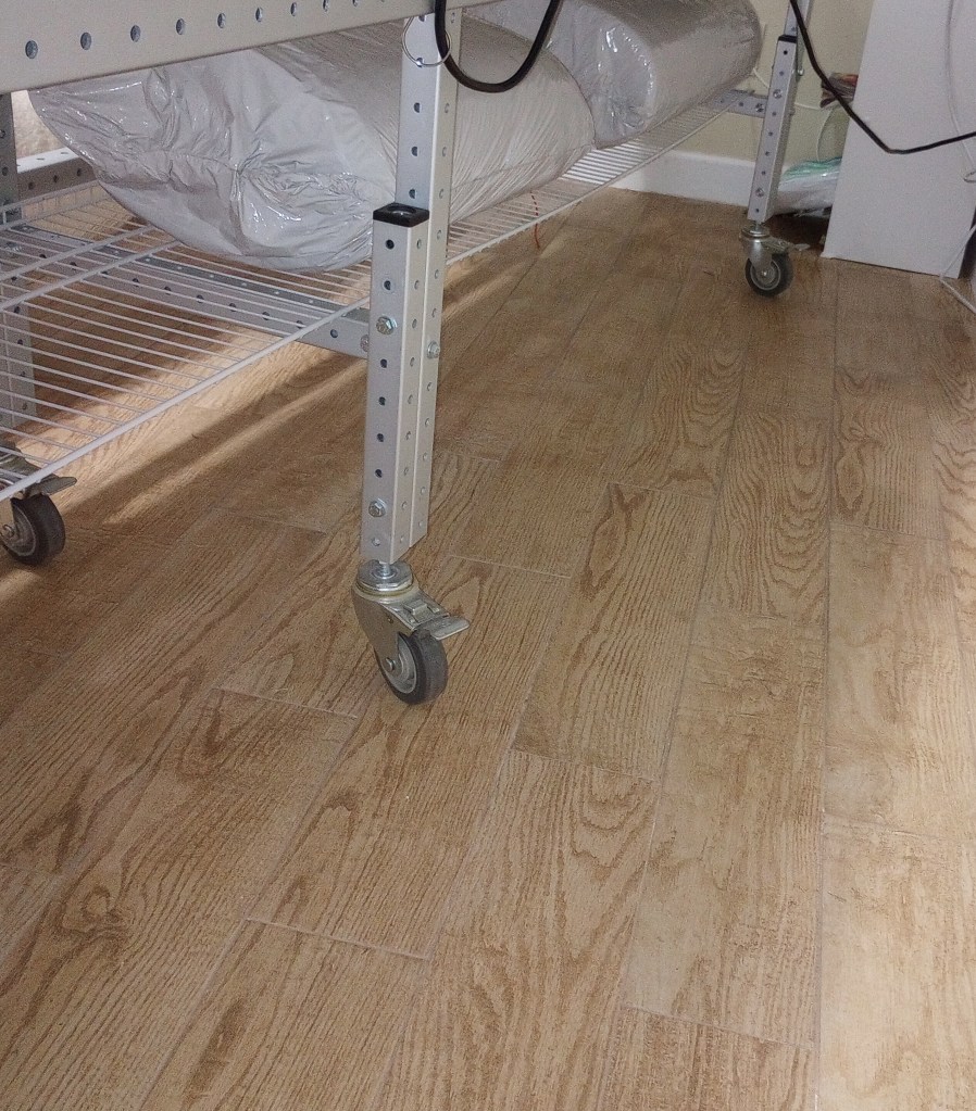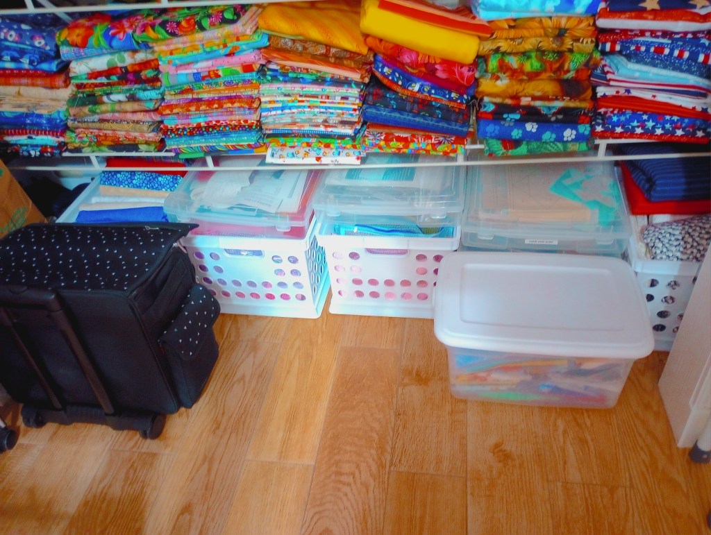 A switch on my long arm broke, so I’ve been organizing while waiting for the part. The room doesn’t really need it, but we expect our hurricane windows to be installed in 4 to 6 weeks. When we get the notice from the installer, I’ll have to quickly move everything to one corner. I’m using these couple of days to consolidate as much as I can. All the furniture is on casters, including the long arm frame, so moving things shouldn’t be too difficult.