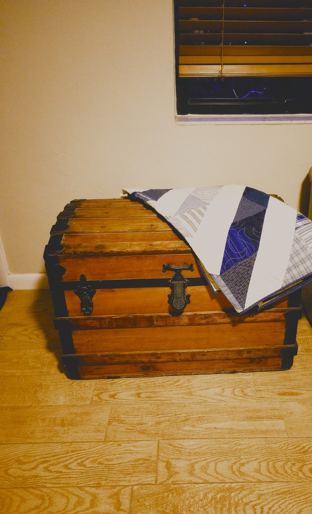 The hump back trunk is between the end of our couch and our front door. It’s also an antique. My mother gave me the money to buy it for my 40th birthday. At the time, it felt like a lot of money. All these years later I now realize what a bargain it was in the thrift store and why she had said “run back and get it!!!”. She passed away the following year so it’s especially sentimental. Inside are a couple of quilts she made and a couple of mine.