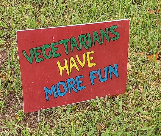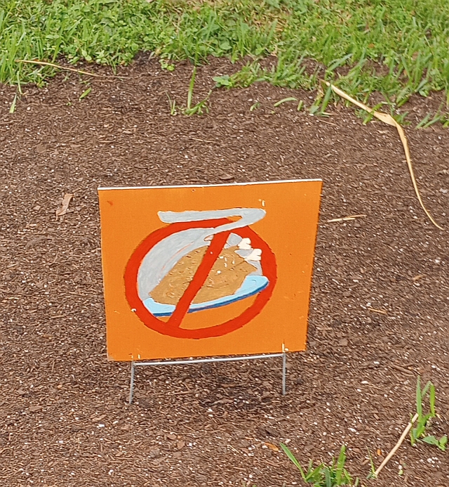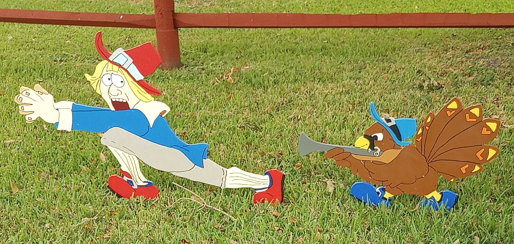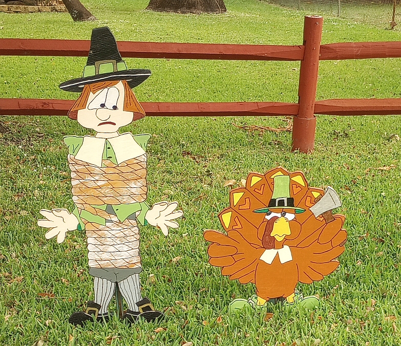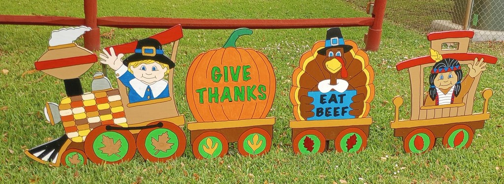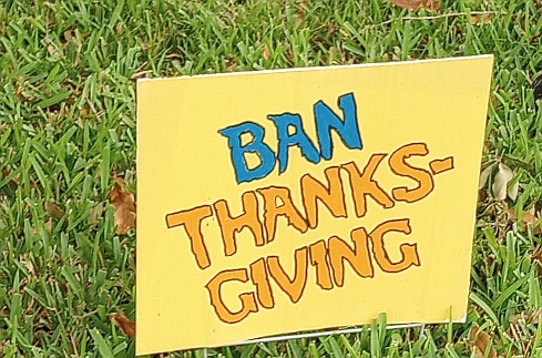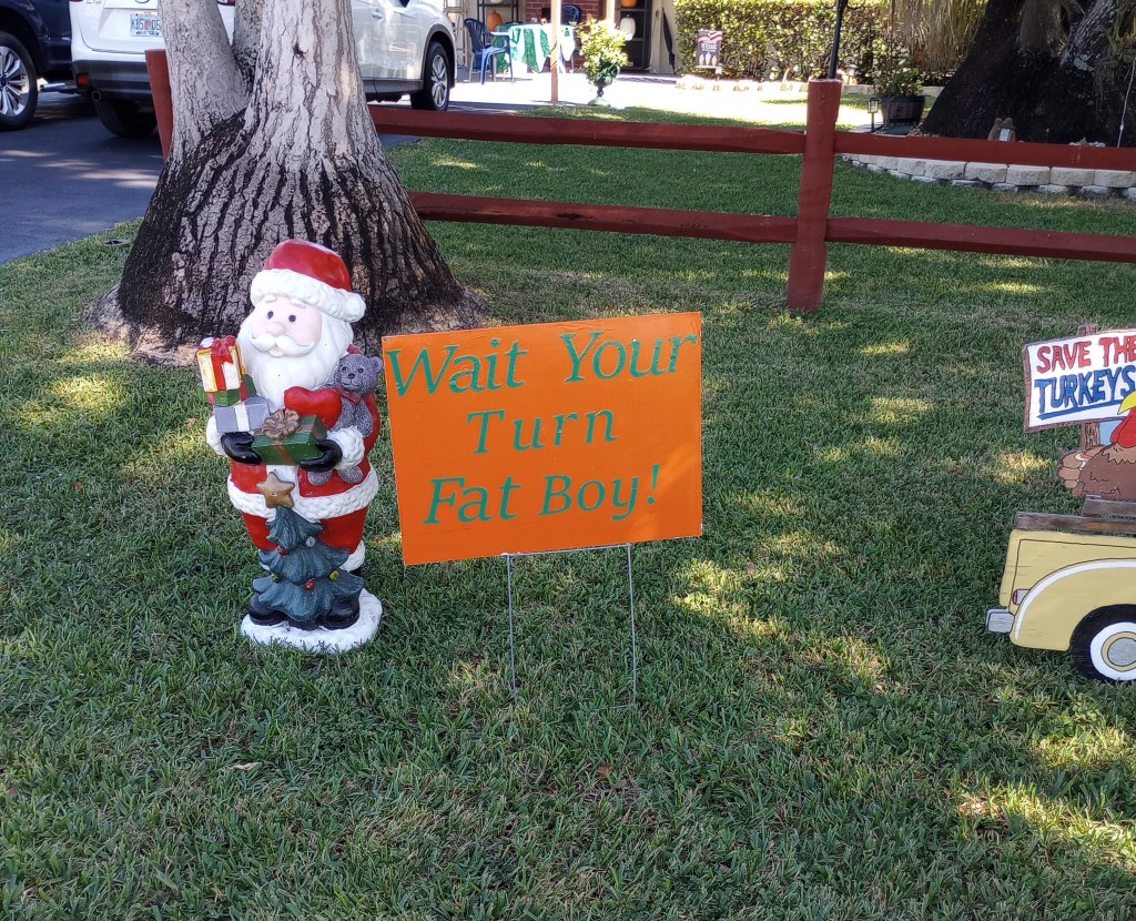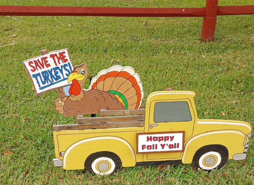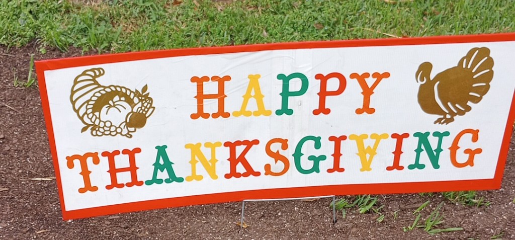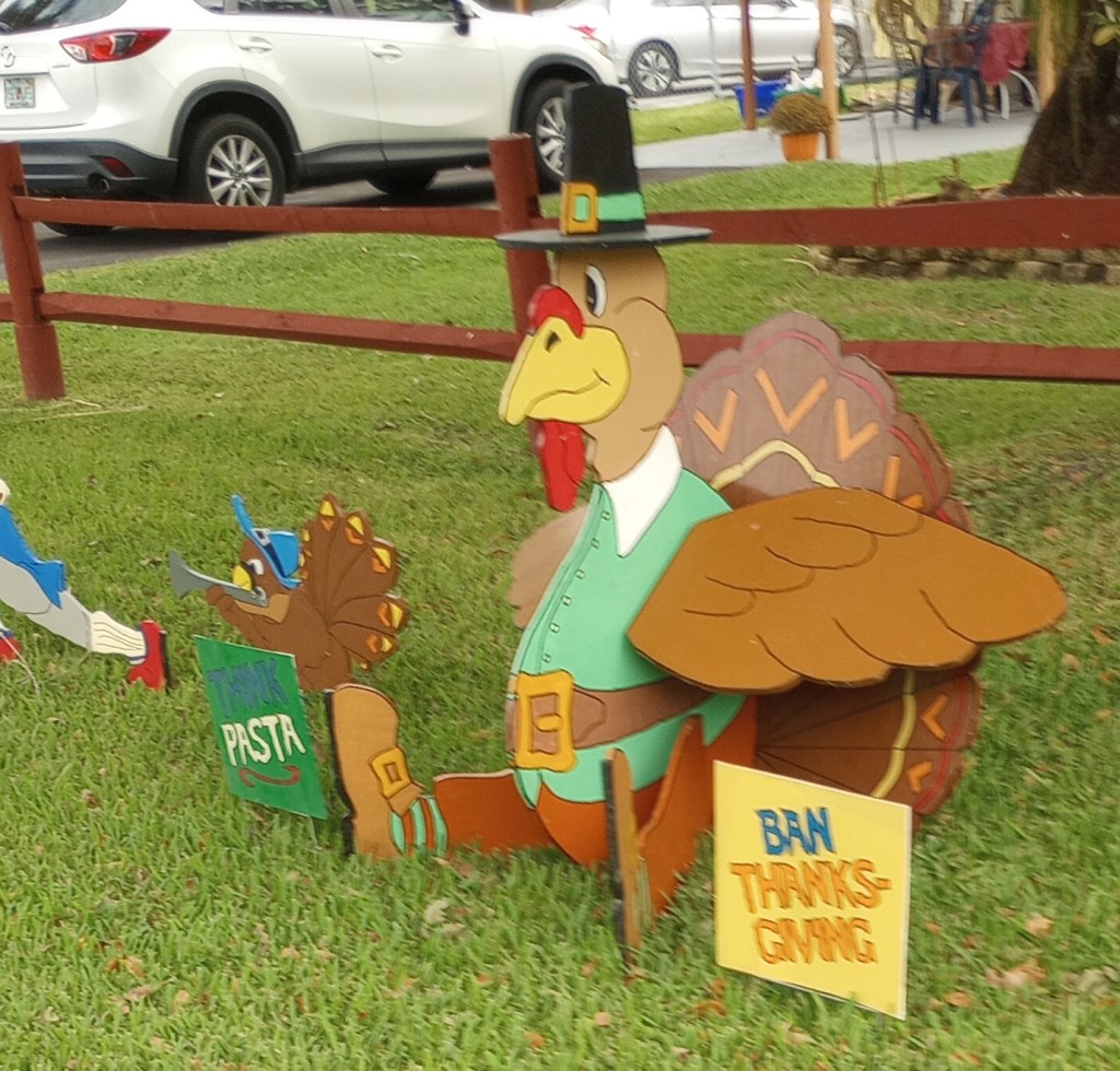 Last year he made a few turkey protest signs from discarded political campaign signs. The neighbors love it. Just today a couple of students walking home from school thanked him for celebrating Thanksgiving. Then laughed when they saw the “fat boy” sign and stopped to take a picture of it. 😉
