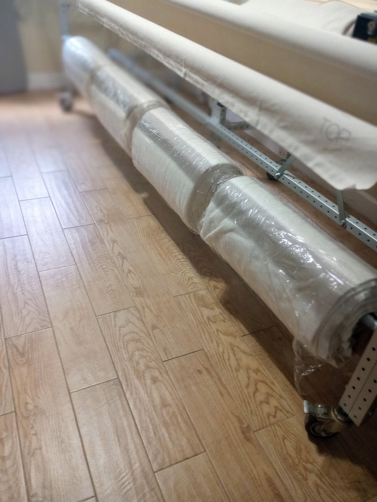 I posted this before. It’s 4 bolts of the batting on a bar my husband attached to the long arm. We just split the cardboard bolt in the center and slip the bar through it. I move the frame away from the wall when I want to quilt behind it so I don’t like storing anything underneath it.