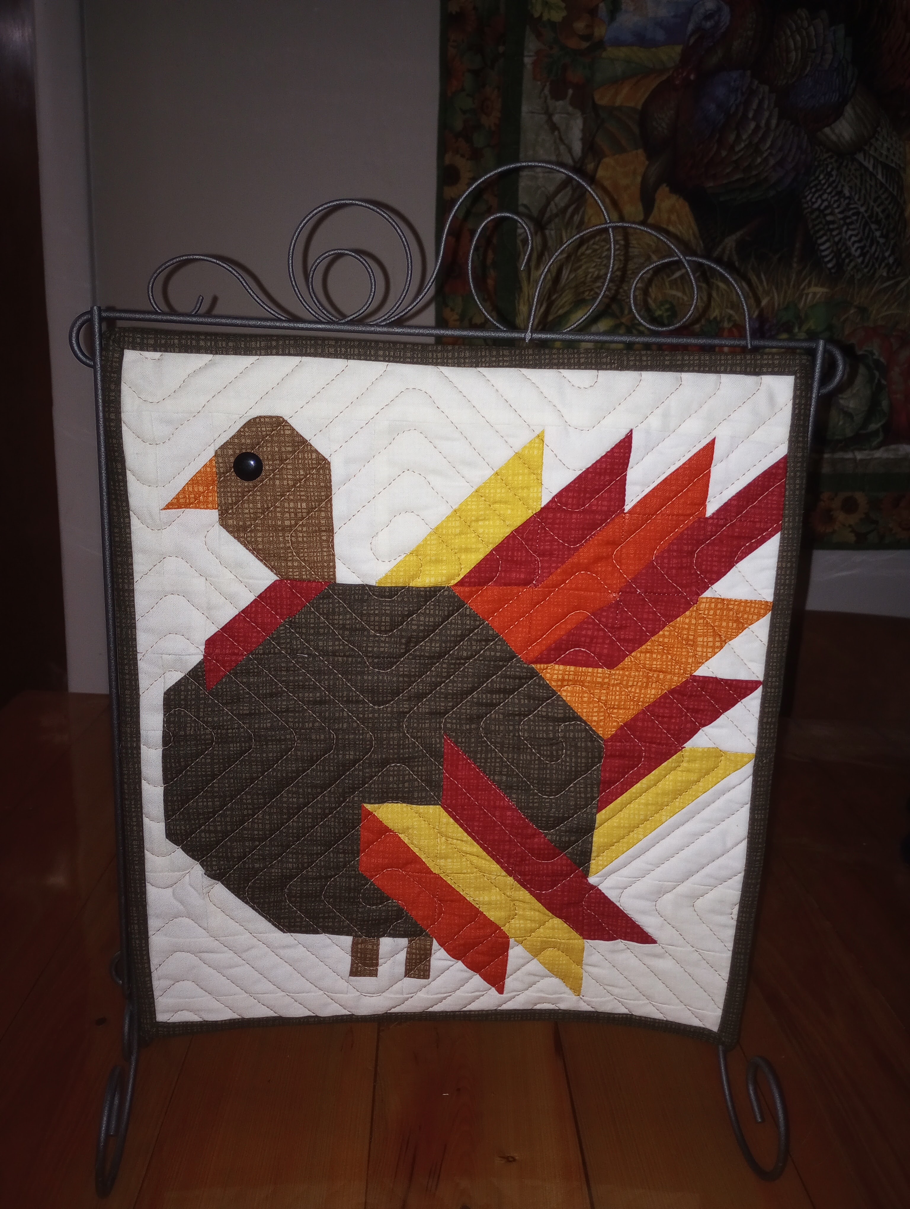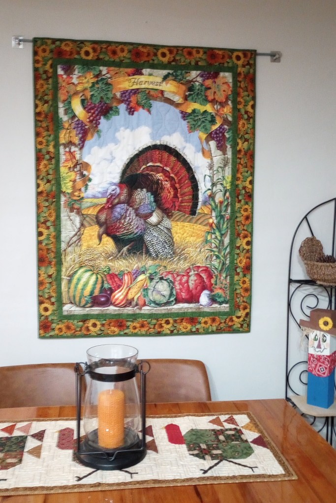 My other show & tell was this little table topper “Not Kitten Around”. It’s part of a Riley Blake calendar series. I’m not making them all but I was able to purchase this individual month from our local quilt shop, Quilt a Bit. I bought the turkey today to make for Thanksgiving. They’re small at only 12″ x 14″ but that’s just the size I need fit the stand I already owned.