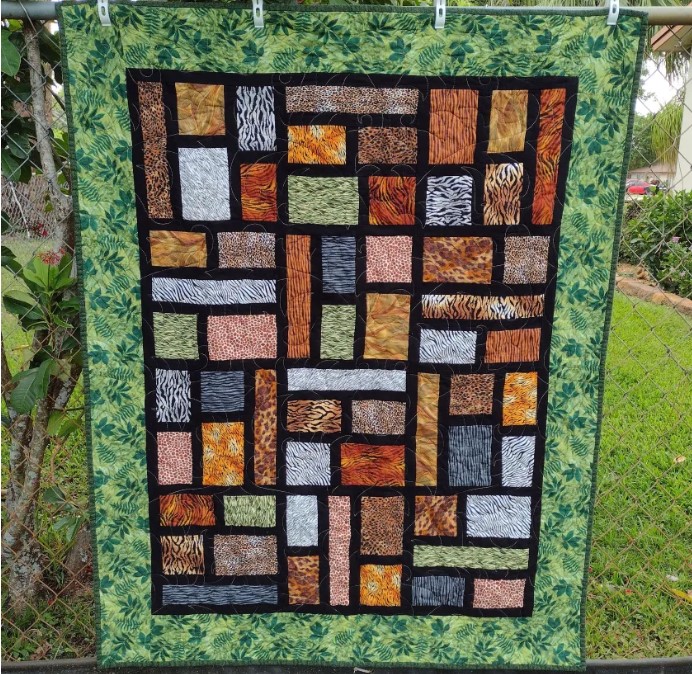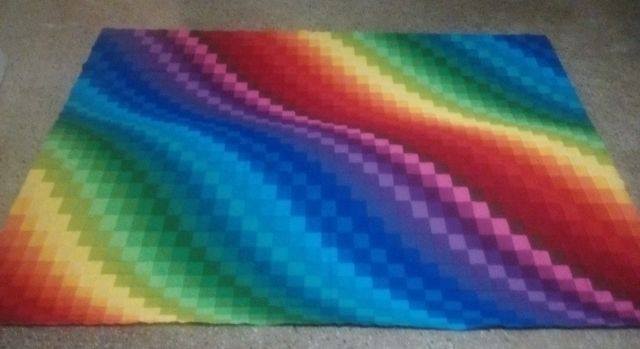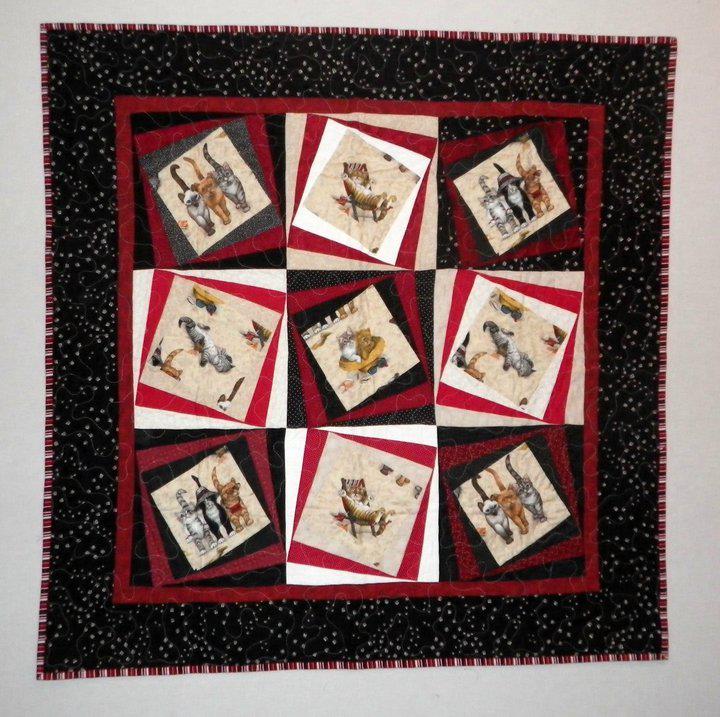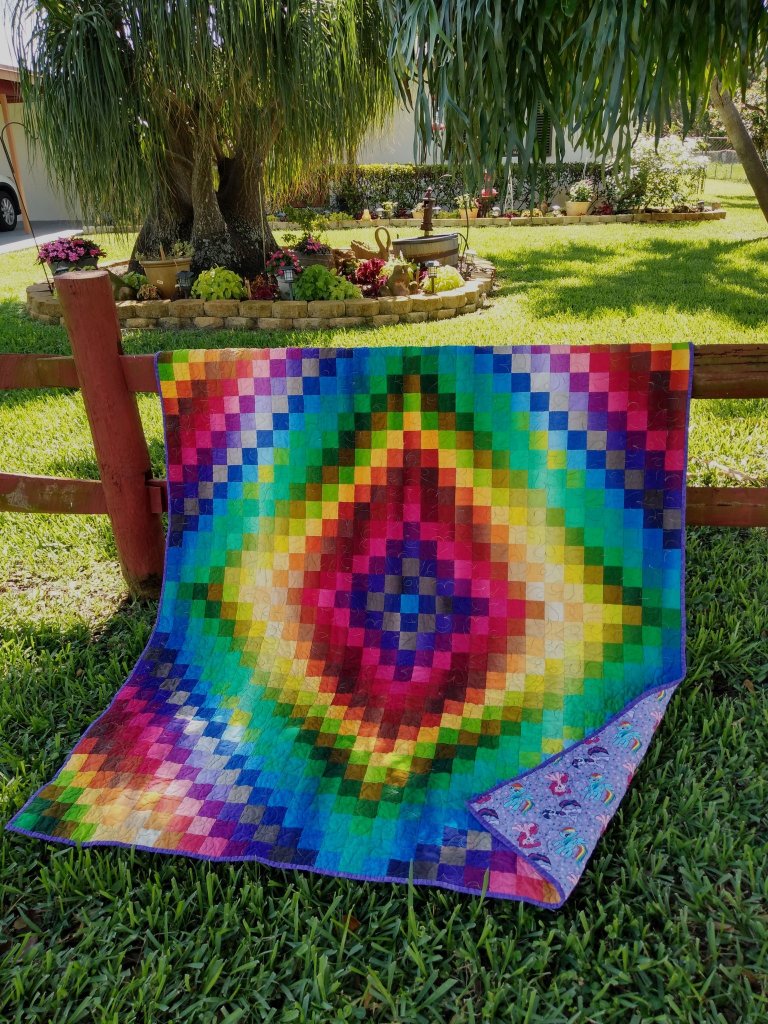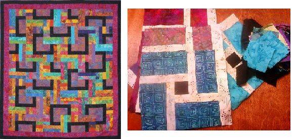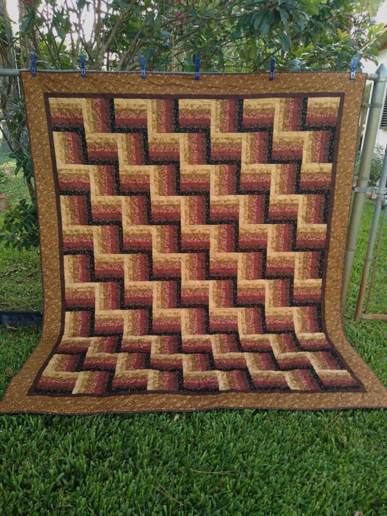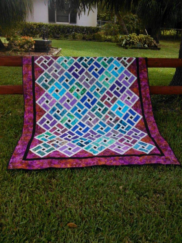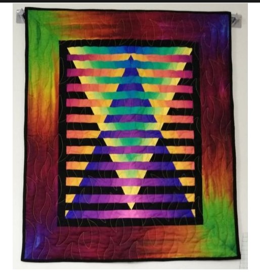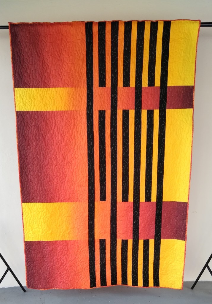 Illusion – started, put aside, and then taken out and finished one afternoon when I was really upset with an extended family member. This one was quilted by the same friend with flames (at my request). When I see it I remember that sometimes life is an illusion and relationships can easily go up in flames!