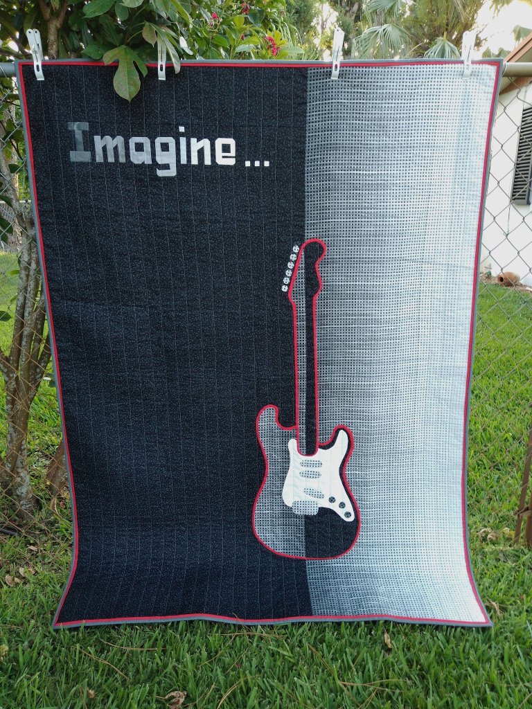 I couldn’t help but think of how little has changed in the nearly 50 years since John Lennon wrote the song Imagine. I hand appliqued the guitar pieces as I watched the news of mass protests and uprisings across the globe over the killing of George Floyd on May 25 2020.
