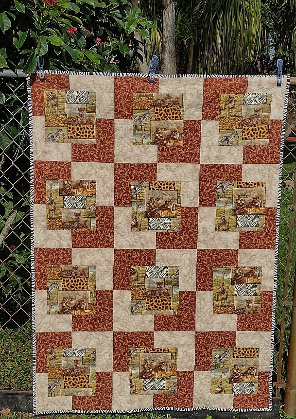 I wanted to try making these first 3 quilts after seeing photos from a blog where the quilter had made similar ones in a class. (I’m sorry but I don’t remember the blog.) The method was to use the same strip strata in 3 different layouts. I never saw the last quilt, so I had to guess. It’s the first quilt below. While the class made smaller baby sized quilts, I decided to make adult lap-sized quilts instead. She had chosen animal skin prints for the class. I fell in love with her quilts the minute I saw the photos and remembered I had a yard each of these prints still on my fabric shelves. I gave them to my 3 step-grandsons: Robert, Matthew, and Joseph.