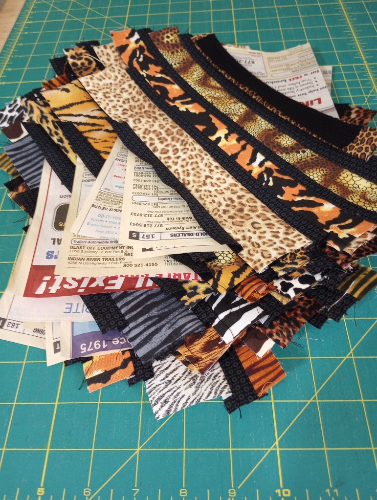 I had a lot of short pieces in the little drawer of animal skin prints. I usually save the shortest ones to use last, but not this time. I had an idea I wanted to try and two pieces of leftover backing that would work to get the woven effect I wanted.