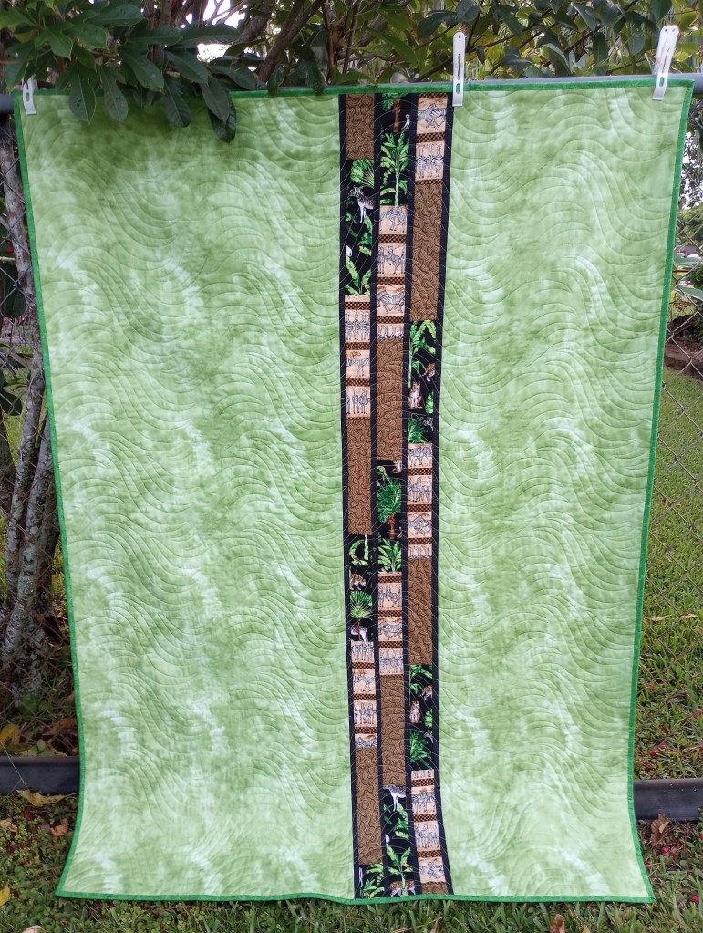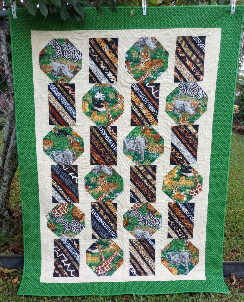 I originally used this fabric for the border. The design matched the jungle print, but it did absolutely nothing for the quilt. I decided to replace it with the green border and I’m happy now that I did.
