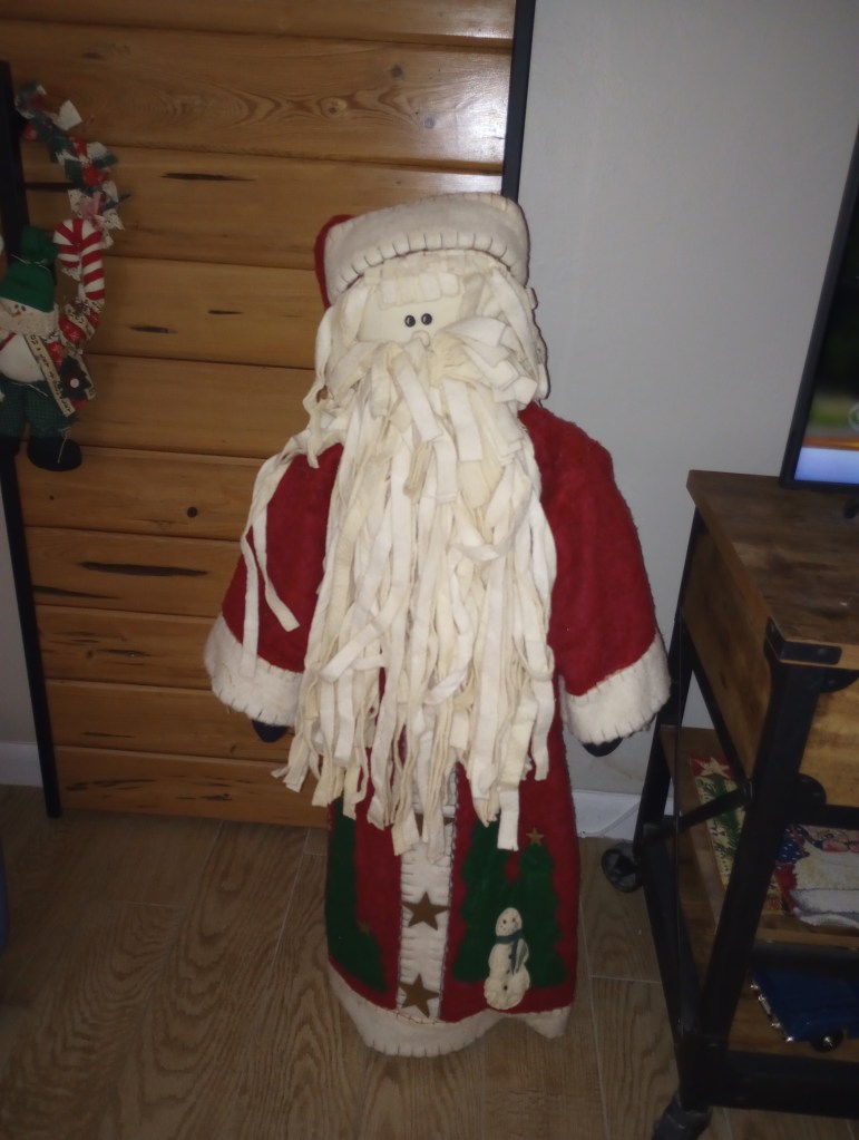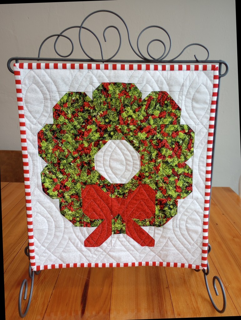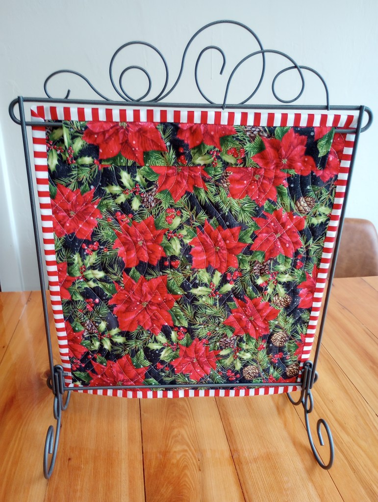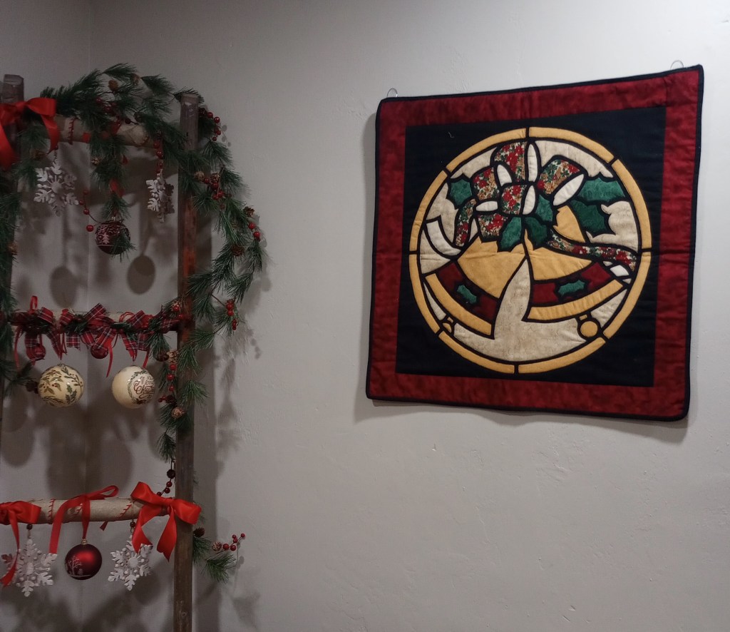 I apologize for the late afternoon photo that distorted the true colors. It’s a much brighter Christmas red and green than it looks here. But, it’s in a prominent place on the wall over our living room TV so it’s unlikely I’ll get a better photo of it this year.