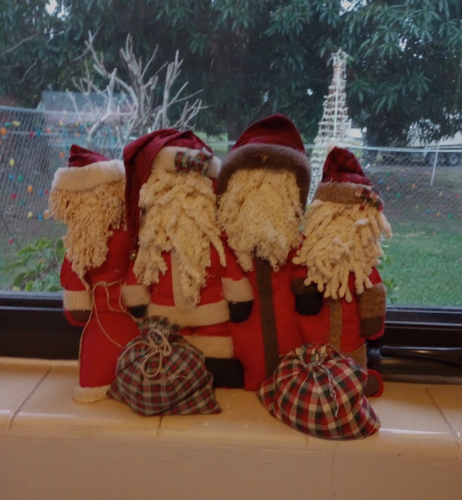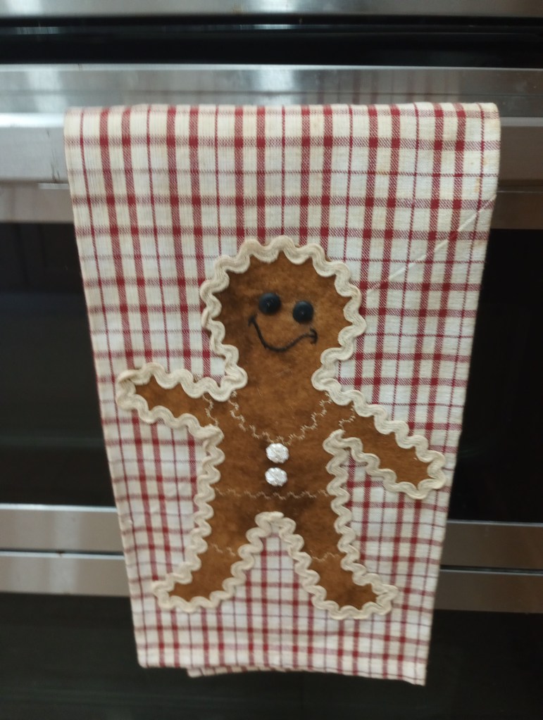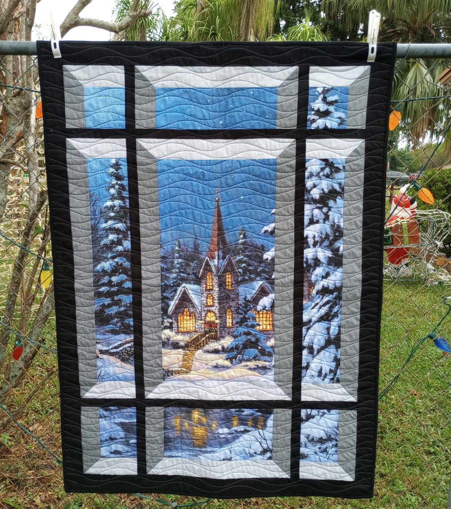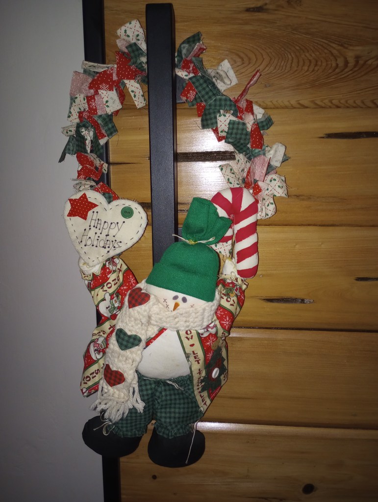 I apologize for the late afternoon photo that distorted the true colors. It’s a much brighter Christmas red and green than it looks here. But, it’s in a prominent place on the wall over our living room TV so it’s unlikely I’ll get a better photo of it this year.