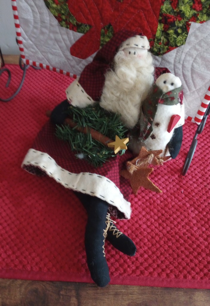 My friend Robin made the wall hanging below several years ago. She even hand quilted it! I’m pretty sure it was around 20 years ago that she gave it to me, not long after we discovered our mutual interest in the same type of quilts and fabric designers. I put it up every year and I’m always awestruck that she gave me something that she hand quilted. ♥ We’re still good friends but she went on to become a much, much better quilter than I could ever aspire to be!