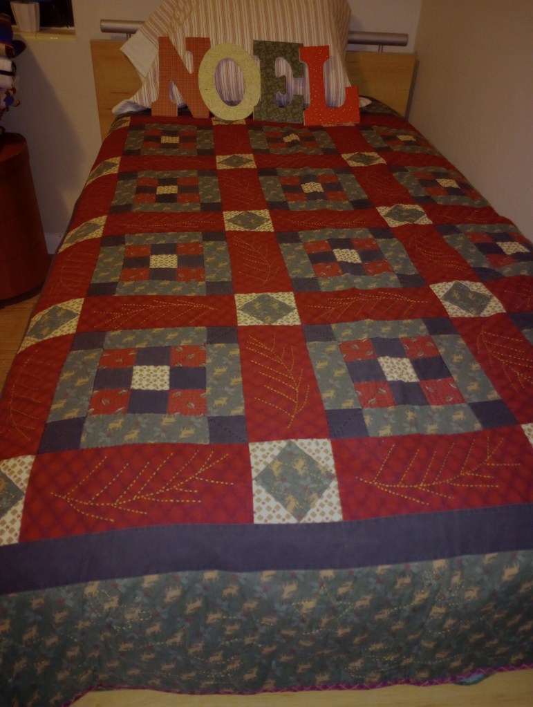 Speaking of hand quilting, I did this quilt by hand in 2002 and gave it to my husband for Christmas. I dearly loved Thimbleberries fabric at one time but now, I rarely make quilts using them. Though the saturated colors are a bit heavy feeling for the rest of the year in our hot and humid south Florida climate, they’re always a welcome sight at Christmas time.